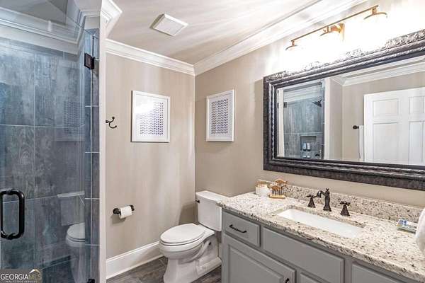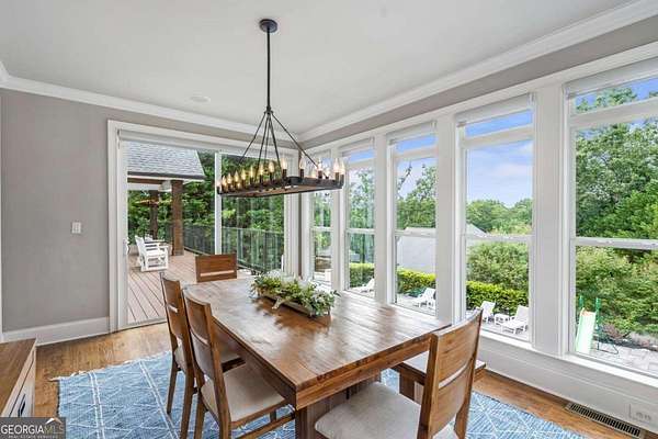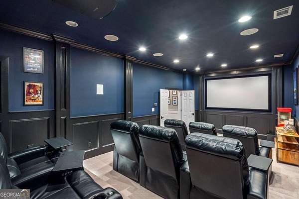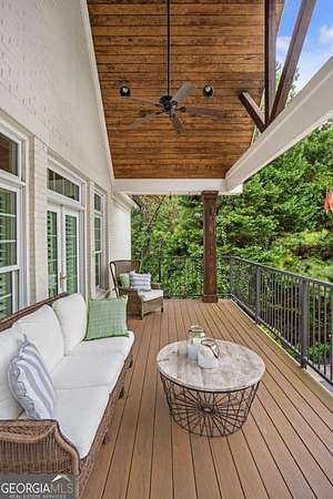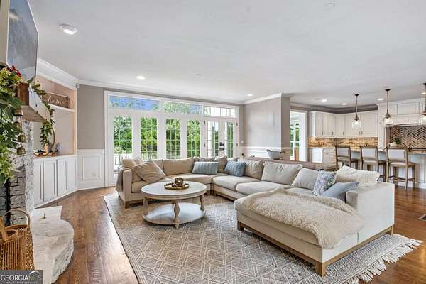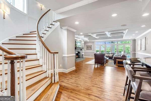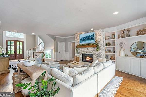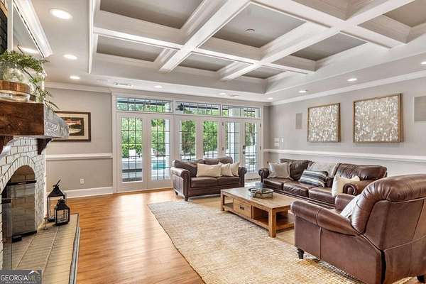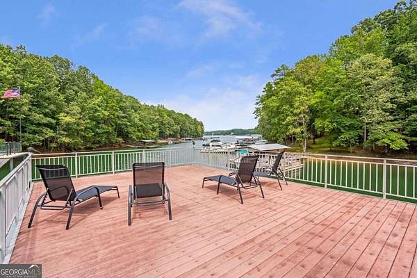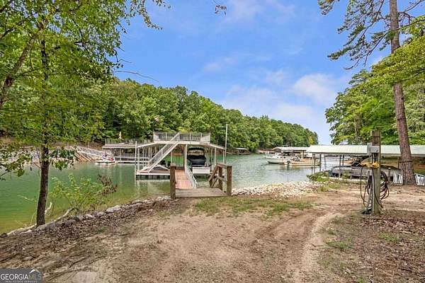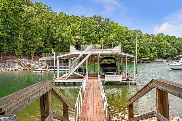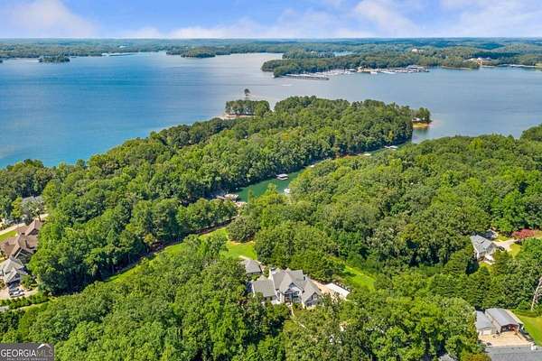 Exceptional lakefront estate in a private gated setting on Lake Lanier with a double-slip, two-story dock in a deep-water cove. Elegant interiors feature a two-story foyer, fireside family room, and chef's kitchen with Sub-Zero and Wolf appliances, dual dishwashers, and an oversized quartz island. The main-level primary suite offers a private retreat, while upstairs includes four bedrooms and two baths. The finished terrace level boasts a theater, billiards room, bar, office, guest suite, and direct pool access. A detached guest house offers a full kitchen, living area, two bedrooms, and two baths. Resort-style outdoor living with pool, Trex deck, outdoor bar, and landscaped grounds-turnkey luxury lake living.