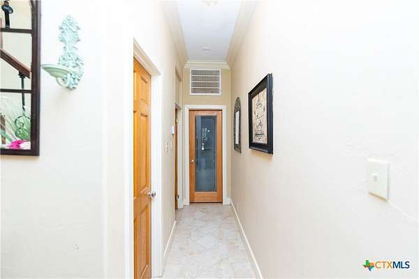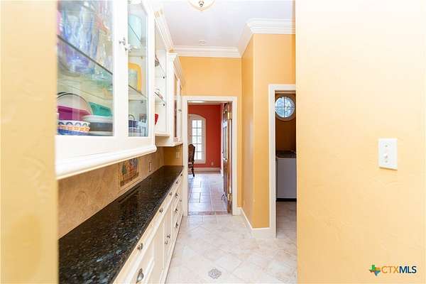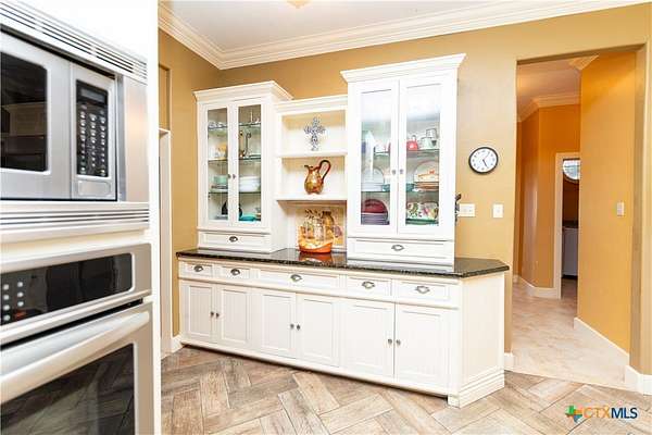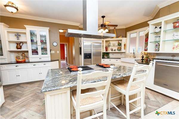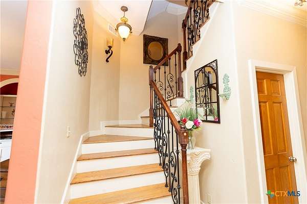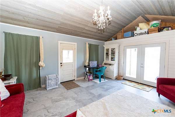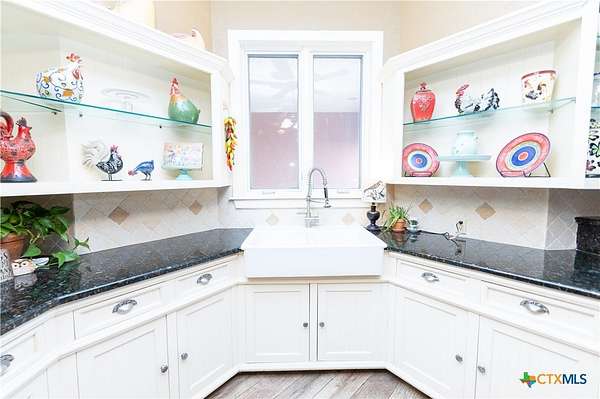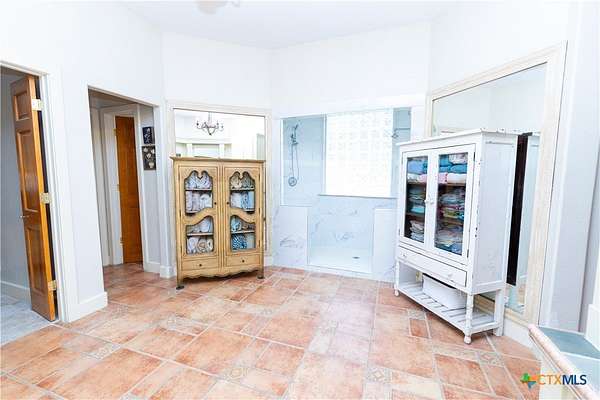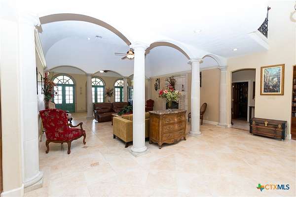 Discover the epitome of country luxury with this Mediterranean-style horse property in Lavaca County. Spanning over 12 acres, the estate blends expansive outdoor living with refined indoor elegance, centered around a home that exudes fine living at every detail. This Luxurious Mediterranean residence with decorative metal doors opening to a dramatic great room. The kitchen is equipped with built-in China cabinets, pantry, granite countertops, apron sink, and premium appliances including a Viking gas range and Sub-Zero refrigerator. A formal dining room, adjoining living room with a wood-burning fireplace, and an inviting office. Primary suite designed for comfort and privacy, featuring a generous seating area, direct outdoor access, a double vanity bathroom, oversized shower, laundry space, and his/her walk-in closets with separate toilet rooms, and laundry hookups. Six bedrooms and three baths plus utility space and extra rooms; an additional multipurpose room offers flexible living options. Ornate metal railing along the stairs and foyer balcony, adding a touch of artistry. Outdoor oasis: inviting backyard, covered back porch, pavilion, and a detached studio ready for use as a workshop, studio, or guest space. Barns on the property support livestock and storage, with oak trees providing classic Texas charm and shade. This home is designed for those who crave space, quality finishes, and the lifestyle of a rural retreat without sacrificing modern comforts. With abundant room for horses and activities, you'll never want to leave this turnkey property.