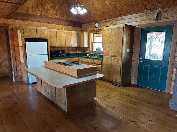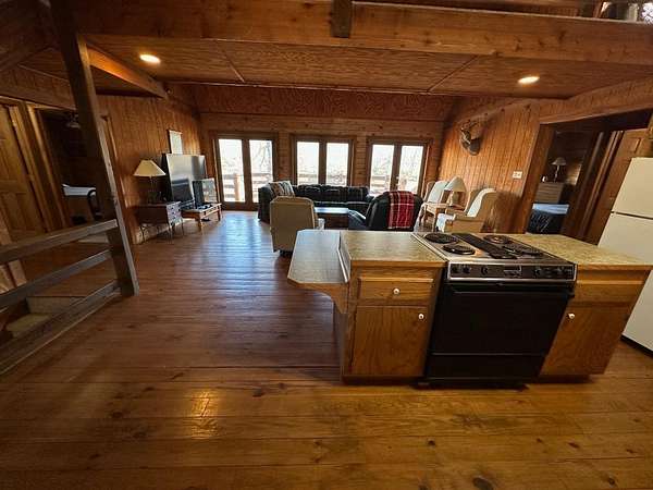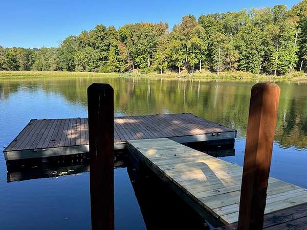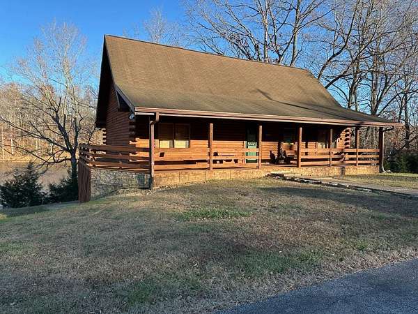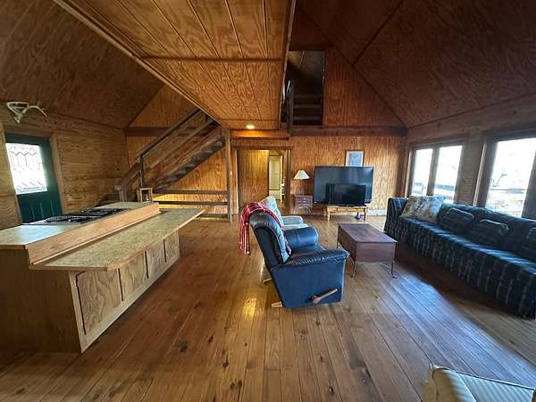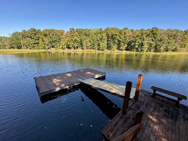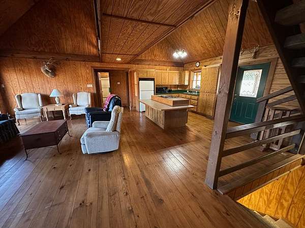 The cozy 4 bedroom, 2 bath, main level guest cabin includes an open floor-plan with amazing lakefront views, a loft overlooking the great room, walkout basement on the lake side, wrap-around porch, and a dock for fishing on the lake. The detached double overhead door building situated across from the cabin is the perfect place to use as a garage or for storing your outdoor toys