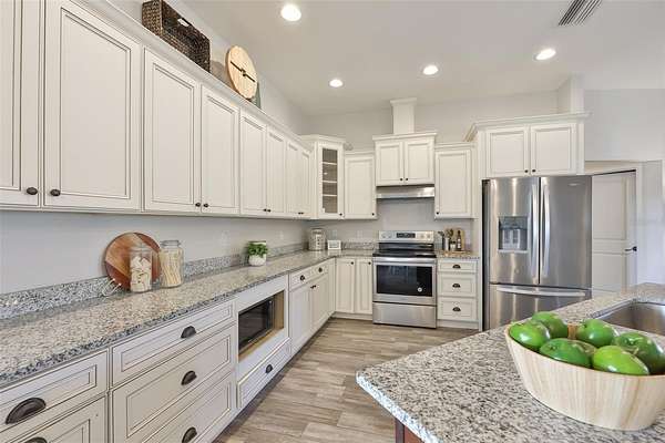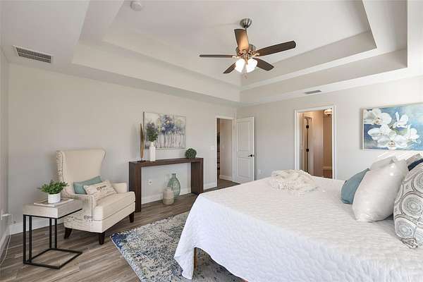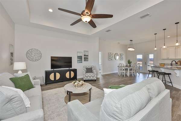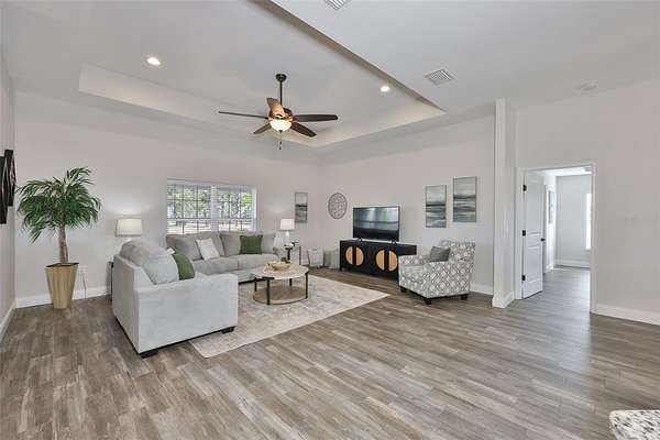 - Ceiling Fans(s), Eat-In Kitchen, High Ceilings, Kitchen/Family Room Combo, Open Floorplan, Primary Bedroom Main Floor, Solid Surface Counters, Solid Wood Cabinets, Split Bedroom, Stone Counters, Thermostat, Tray Ceiling(s), Walk-In Closet(s), Window Treatments