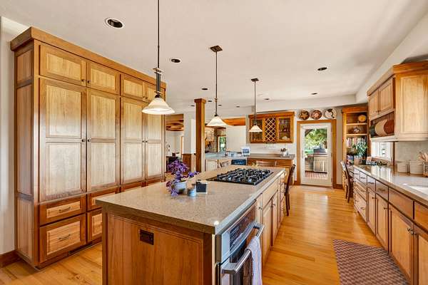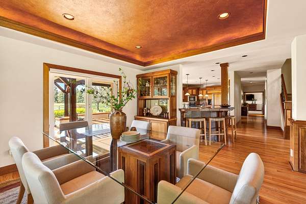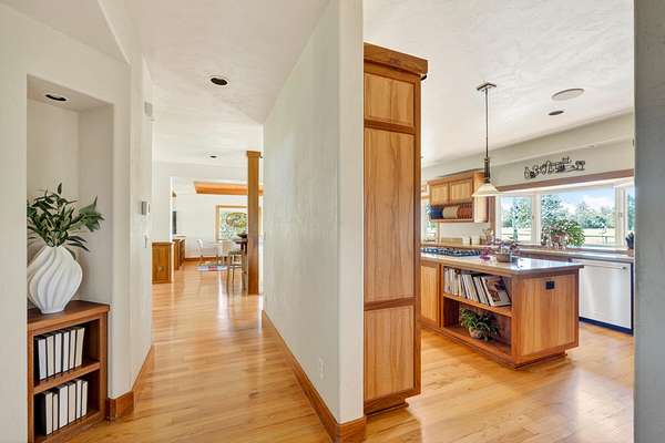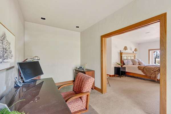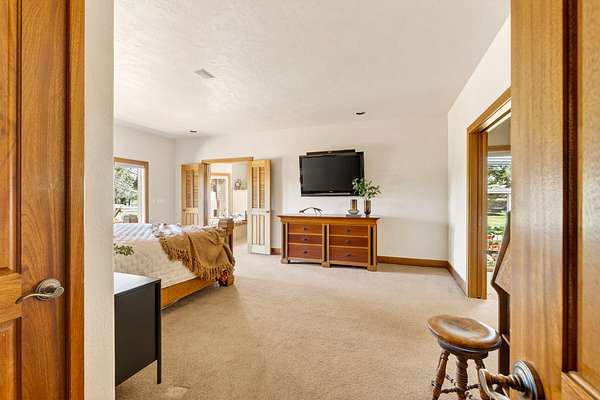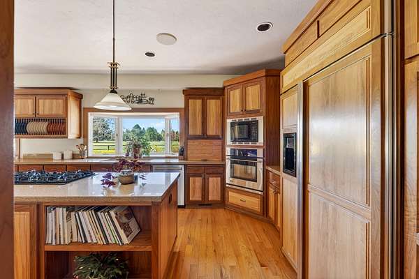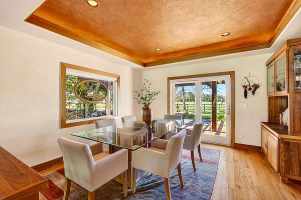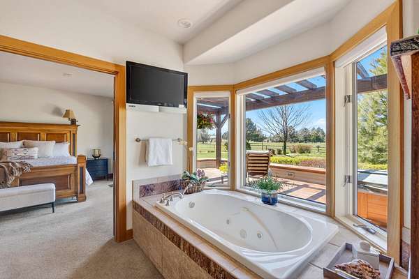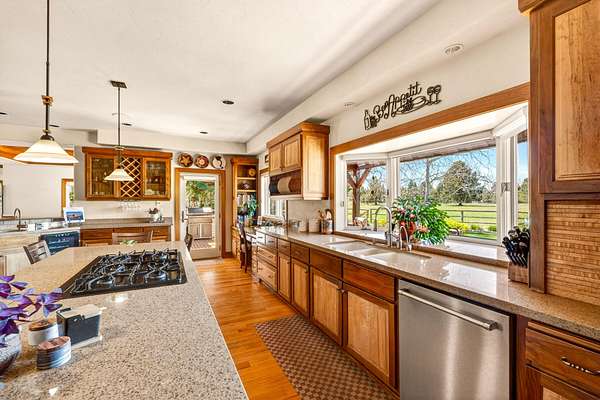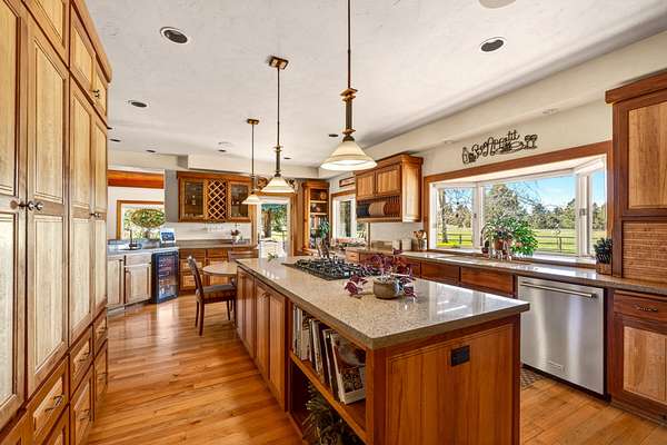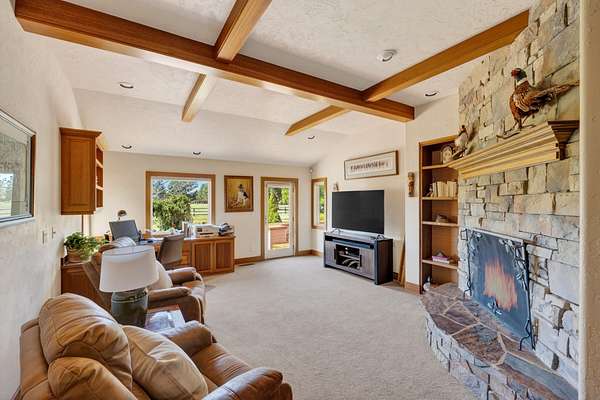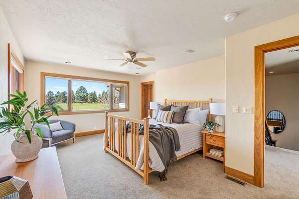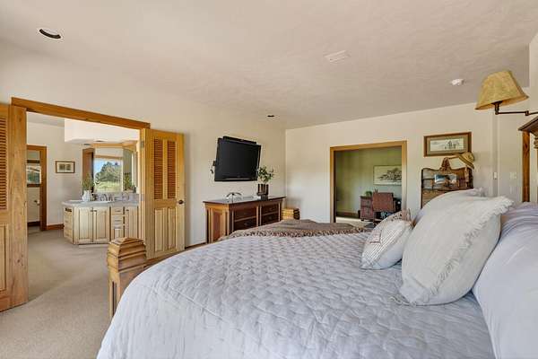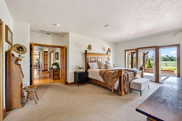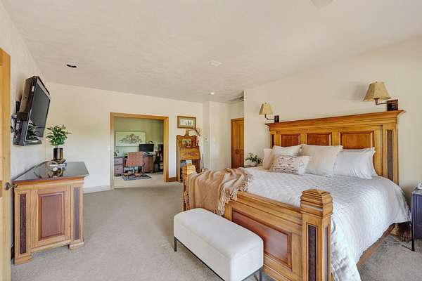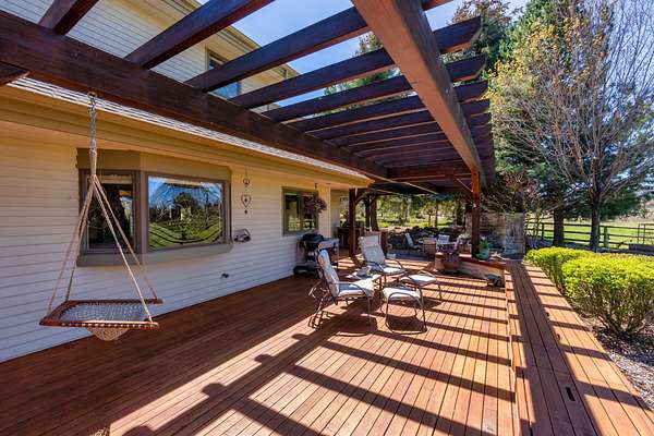 Set on nearly 20 acres of peaceful, private land, this exceptional property captures sweeping mountain views and unforgettable sunsets from expansive west-facing decks. Thoughtfully remodeled by Norman Builders in 2015, the home blends timeless design with meticulous upkeep. Three tranquil ponds attract local wildlife, while 8 acres of irrigation rights enhance the land's versatility. Inside, the main level flows effortlessly from the chef's kitchen to open living and dining areas, with multiple office spaces, a well-appointed primary suite, and an additional ensuite bedroom--ideal for guests or multigenerational living. Upstairs features two spacious ensuite bedrooms and baths, along with generous storage. 1323 sq ft outbuilding plus 490 sqft lean-to offers room for a motorhome, workshop, or hobbies. A rare offering defined by serenity, space, and refined country living.