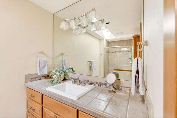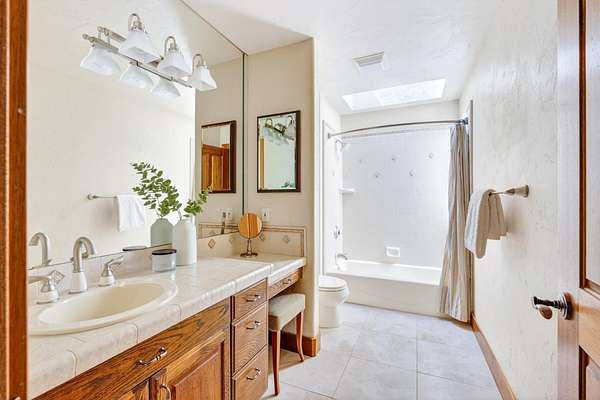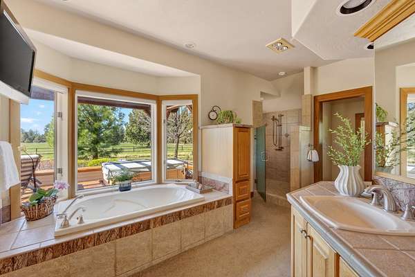 - Central Vacuum, Double Vanity, Enclosed Toilet(s), Granite Counters, Kitchen Island, Linen Closet, Pantry, Primary Downstairs, Shower/Tub Combo, Soaking Tub, Solid Surface Counters, Tile Counters, Tile Shower, Walk-In Closet(s), Wet Bar, Wired For Sound