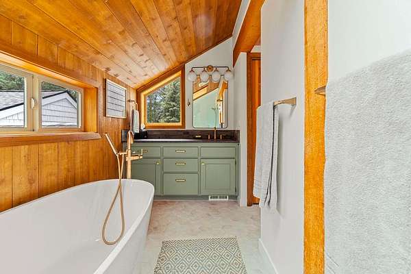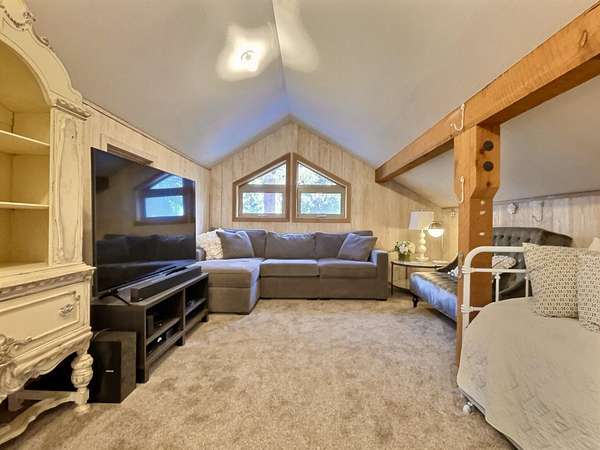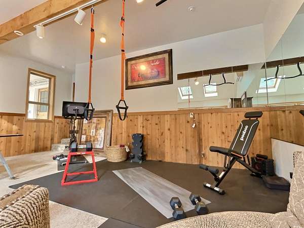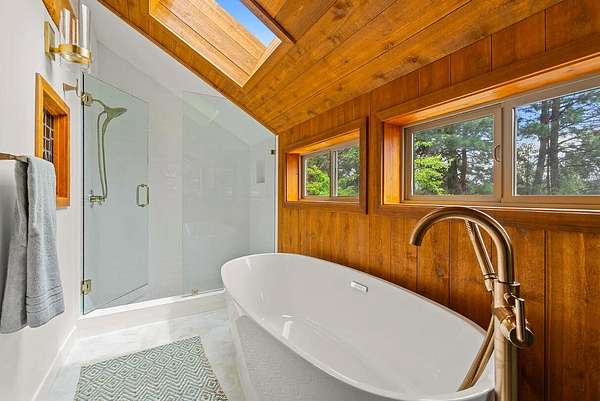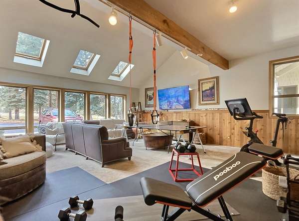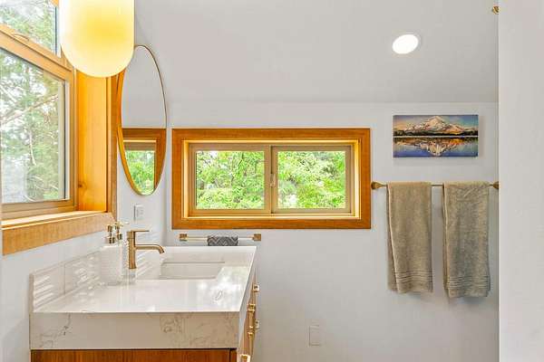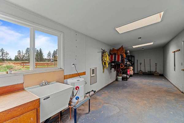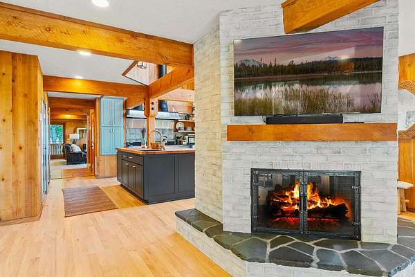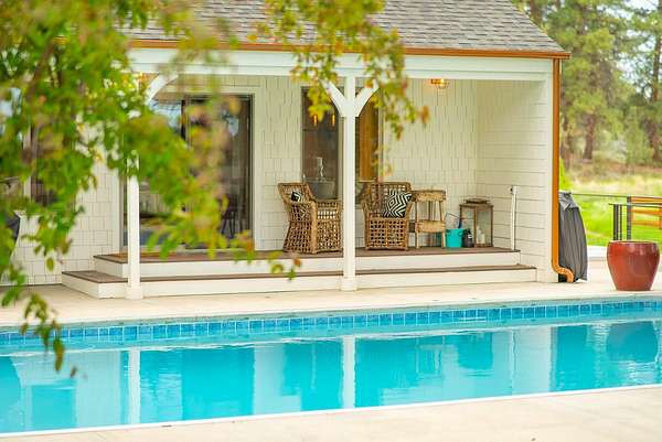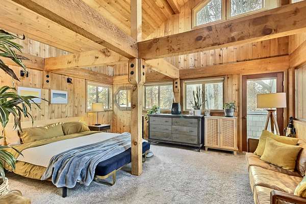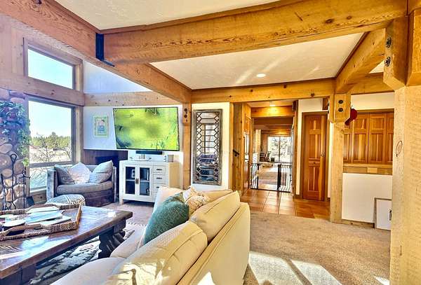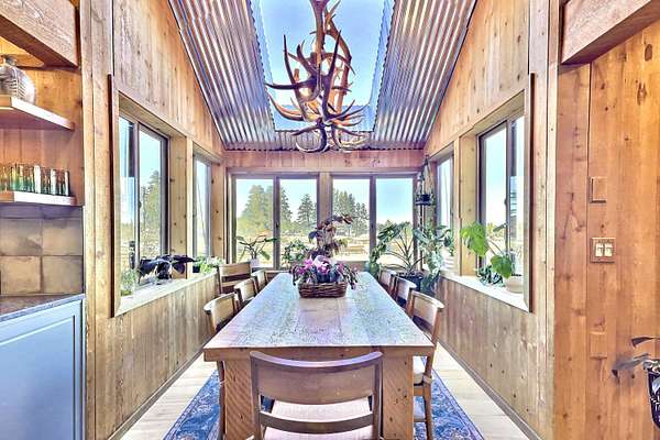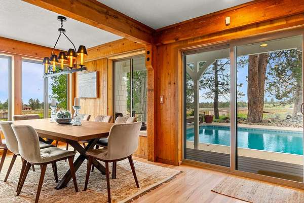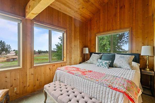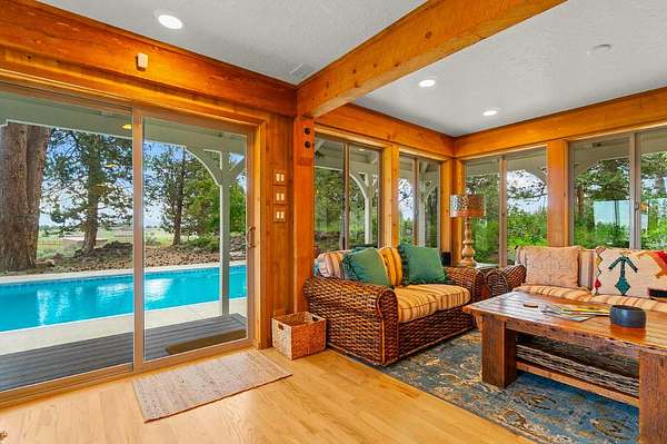 Extensively remodeled, this mid-century farmhouse blends timeless design into a high-desert retreat: a rare mix of privacy and character. Minutes from town yet tucked down a private driveway, the home sits along a canal framed by a grove of century-old ponderosa pines. Set on 15-acres with 3+ acres of water rights, the land offers beauty and development potential. Inside, the home is elegant and cozy. High ceilings, expansive windows, skylights, exposed beams, and curated finishes create a warm, sophisticated atmosphere. The gourmet kitchen is a true centerpiece. The expansive primary suite offers a private balcony and a spa-inspired bath with a soaking tub and walk-in shower. A second en-suite bedroom and guest accommodations span the second floor. Amenities like the bonus room with gym, sauna, pool, hot tub and park-like grounds bring a resort-like rhythm to daily life. For equestrians: a run-in barn and sheltered pastures. BLM trail access fits the dream for all outdoor enthusiasts