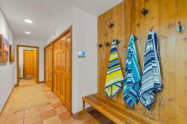 - Breakfast Bar, Built-In Features, Double Vanity, Dry Bar, Enclosed Toilet(s), Granite Counters, Kitchen Island, Linen Closet, Pantry, Shower/Tub Combo, Smart Lock(s), Soaking Tub, Solid Surface Counters, Tile Shower, Vaulted Ceiling(s), Walk-In Closet(s), Wet Bar