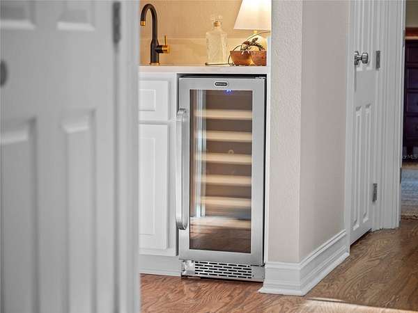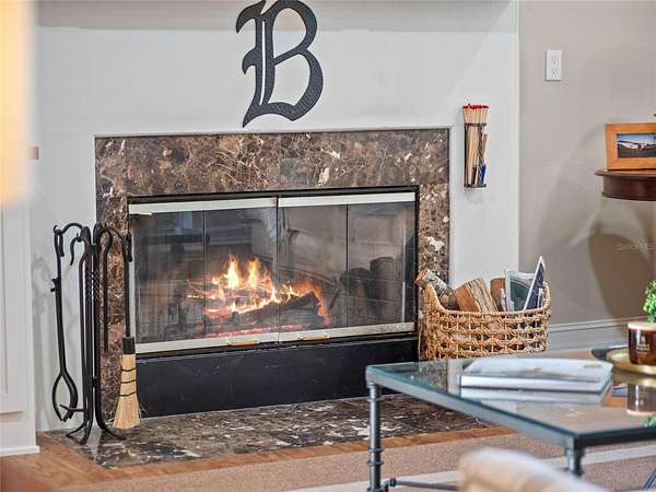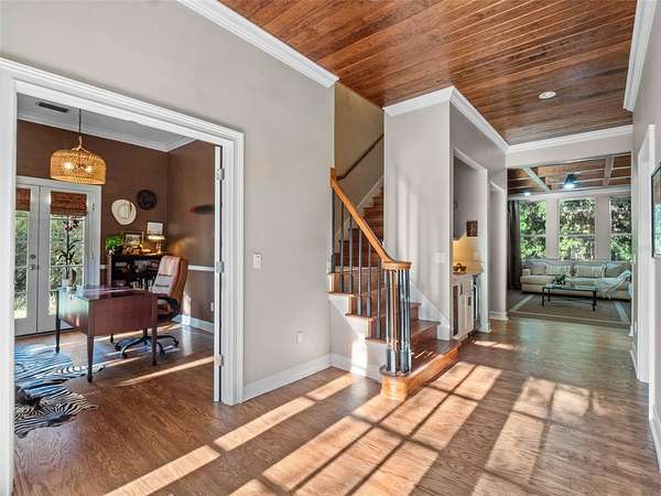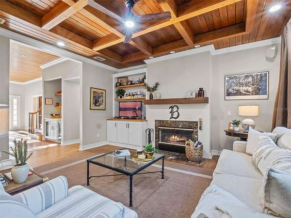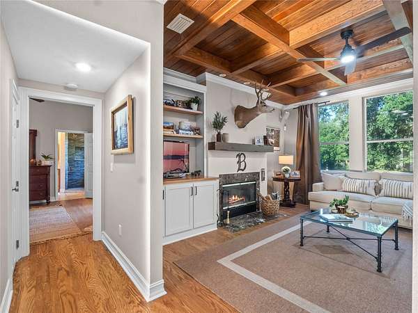 The kitchen opens seamlessly to the living room, where a wood-burning fireplace with a rustic beam mantle anchors the space, complemented by a custom built-in bookcase. A nearby wet bar with wine refrigerator encourages you to pour a glass and stay awhile. The formal dining room overlooks the lush grounds, turning every meal into an occasion, while a private den with French doors opens to a covered porch--an ideal spot for morning coffee or a quiet afternoon escape.