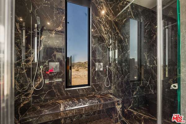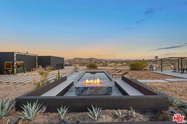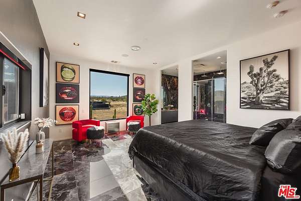 Welcome to your private sanctuary in the heart of Joshua Tree- a striking 4-bedroom, 3-bath architectural gem, which was extensively re-imagined in 2022, that fuses modern luxury with dramatic desert flair. Set against panoramic Mojave views, this custom-built home offers a one-of-a-kind layout, wrapped in a sleek black fade with shimmering metallic accents. Step inside to discover a bold and curated interior each bedroom uniquely designed with vibrant mural walls, upscale finishes, and gallery-quality art. The luxe primary suite boasts a marble-clad spa shower, oversized picture window, and private desert views. Luxury statement tile run throughout, offering durability with high design. Outdoors, enjoy the ultimate entertainer's layout: a sleek black-bottom pool with spa, expansive patio with loungers, and a fire pit lounge perfect for stargazing nights. Cactus-lined paths guide you through the xeriscaped landscape, blending luxury living with rugged natural beauty. Additional highlights include: a chef's kitchen, custom lighting, oversized garage, connected to public sewer/water, and high-end finishes throughout. Located minutes from Joshua Tree National Park yet offering total privacy this home is ideal as a primary residence, design-forward getaway, or high-end short-term rental. Experience the desert elevated.