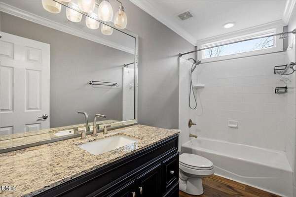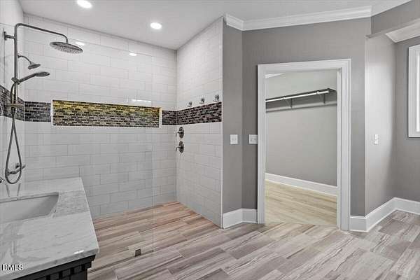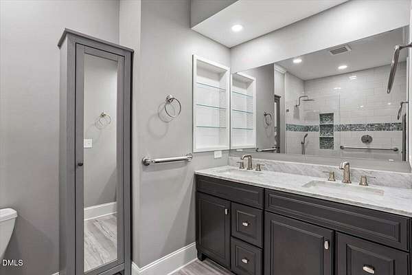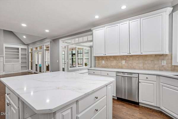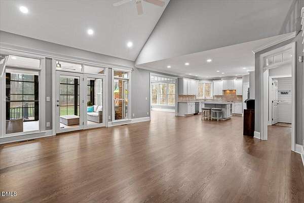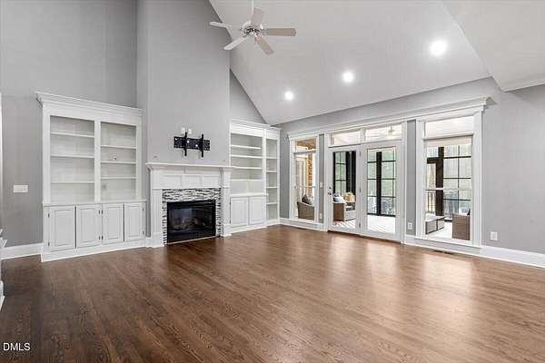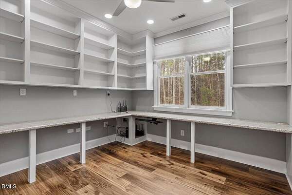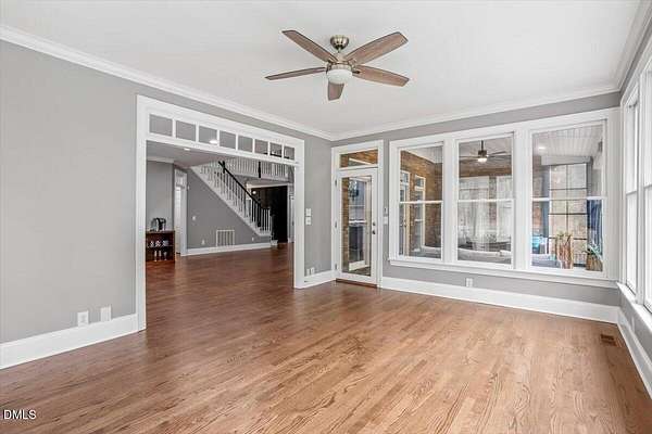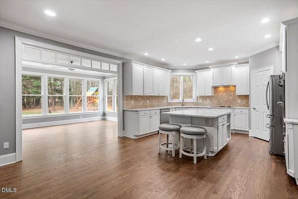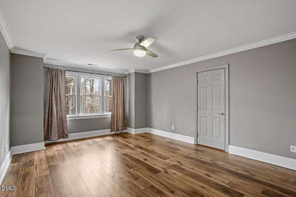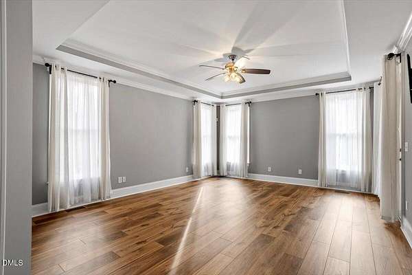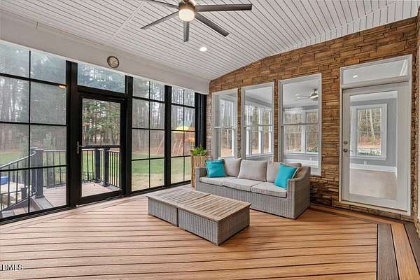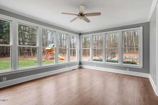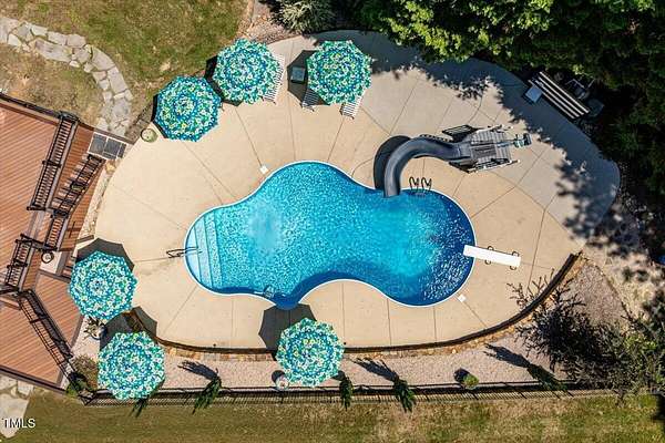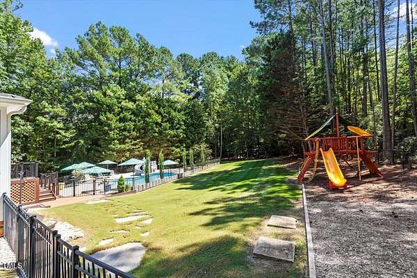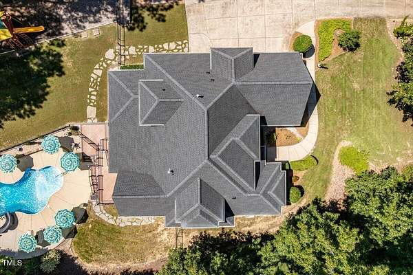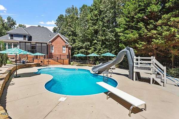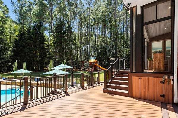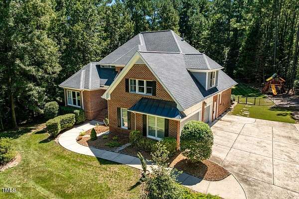 Whether you call it your Private Oasis or your Elegant Estate, this custom home with IN GROUND POOL is nestled on 2.5 acres and is a rare find in the Wake Forest / North Raleigh area! Experience a combination of luxury and convenient living with this 4-sides brick 4,454 square foot home on a quiet cul de sac lot while enjoying the perfect balance of fenced, open areas and natural, wooded borders inside the gated community of La Ventana. This home features a first-floor primary bedroom, COVERED BACK PORCH, sunroom, 3 car garage, and amazing outdoor spaces. Many updates include bathroom remodels, Trex flooring on the deck/back porch, luxury vinyl plank flooring in all bedrooms, bathrooms, laundry room, and upstairs office as well as new carpet in the upstairs bonus room, hallway, and stairways. The spacious kitchen is a chef's dream, featuring a large island, built-in ovens, NEW Quartz countertops, stainless steel appliances, tile backsplash, plentiful cabinet storage, a corner pantry, and an electric cooktop. The first-floor primary suite impresses with access to the covered porch, a tray ceiling, crown molding, nature views, an expansive walk-in closet, and a fully updated bathroom boasting a large walk in shower. The two-story family room showcases built-in shelves, a gas fireplace with tile surround, and the first of two stairways to the second floor. In the dining room, you'll find beautiful wainscotting, columns, a tray ceiling, and a new chandelier. The recently refinished hardwood floors are gorgeous and flow through much of the first floor (as well as just added to the Sunroom). The large flex room could be a first-floor office, entertaining space, or a guest suite having it's own updated bathroom with walk in shower. All bedrooms have their own dedicated bathrooms and walk in closets. The spacious bonus room has built-in shelves and cabinets while the upstairs office is an excellent secluded workspace with it's built-in desks, shelves, and view of nature. The remodeled laundry room displays ship lap walls, a new vanity/sink, and new lighting. There is also ample walk in attic storage. Step outside to your personal retreat: a saltwater pool with diving board and slide, screened porch, large deck, fire-pit, playset, gorgeous landscaping with irrigation system, and two separate but connected fenced areas. The side-entry 3-car garage has an expanded parking pad. The walk-in crawl space has sealed vents and a dehumidifier. Peace of mind comes also with a newer roof (2019), tankless water heater, and whole-house generator (natural gas). This is the ideal location to live in privacy and work from home. Commuters and boaters will also appreciate the easy access to Wake Forest, Raleigh, Falls Lake, RTP, and RDU Airport. Want to make this private oasis your next home?