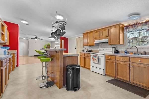 - Blinds, Breakfast Bar, Crown Molding, Electric Range, Laminate Counter, Laundry/Utility Room, Microwave, Open Floor Plan, Whole House Water Filter