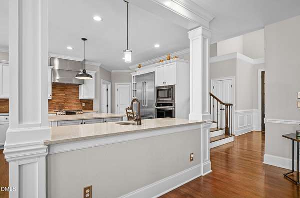 - Entrance Foyer, Kitchen Island, Low Flow Plumbing Fixtures, Pantry, Primary Downstairs, Quartz Counters, Sound System, Vaulted Ceiling(s), Walk-In Closet(s), Walk-In Shower