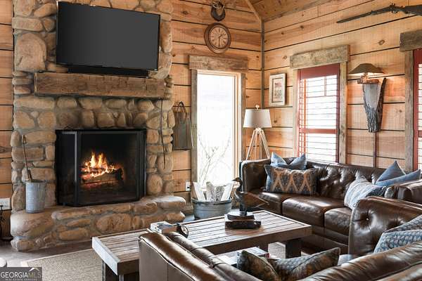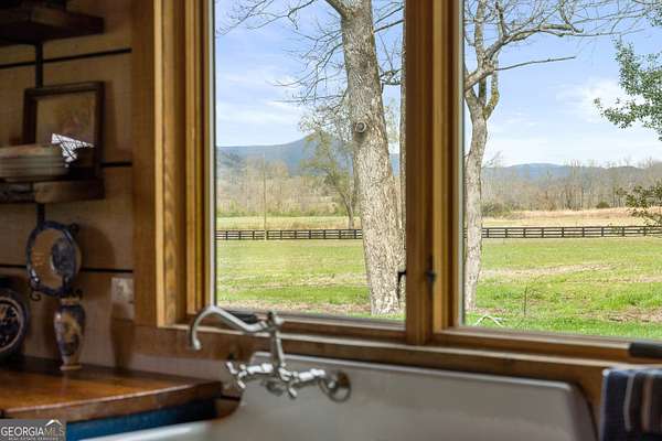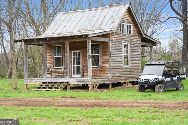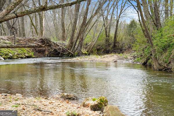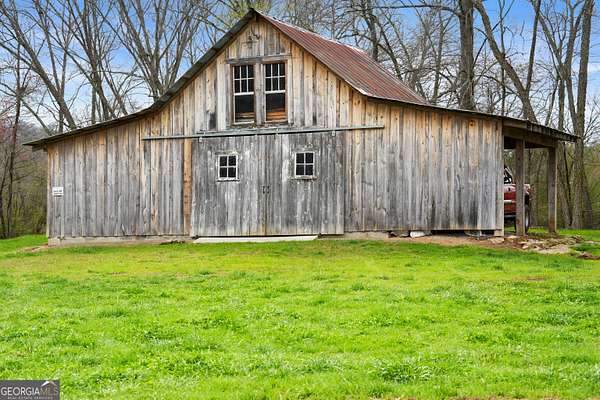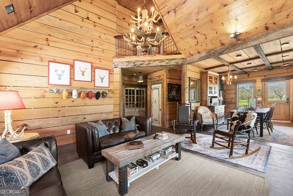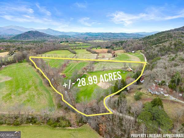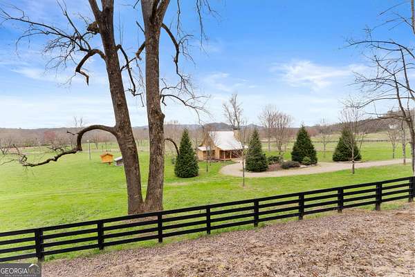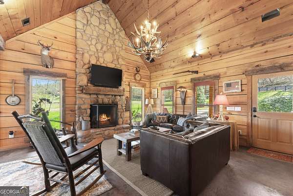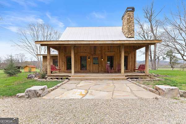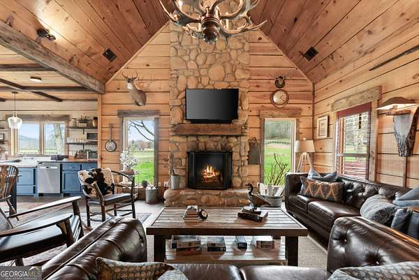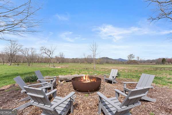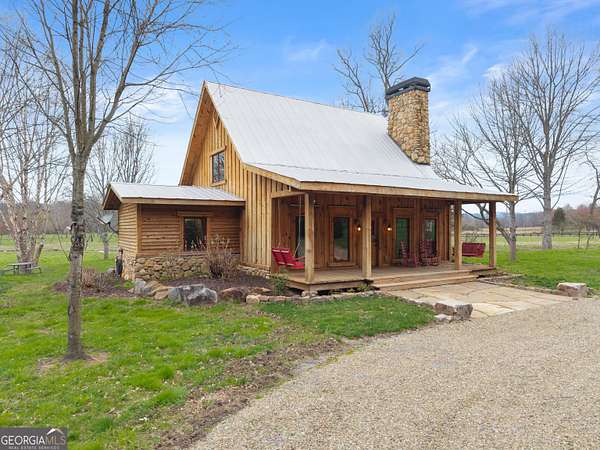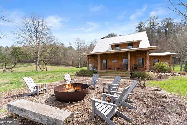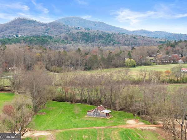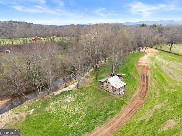 29 Acre Farm with 3BD, 3BA Luxury Cabin, 2000 Ft of Sautee Creek Frontage, and Incredible Long Range Mountain Views! Located in the Sautee Valley on scenic Lynch Mountain Rd, this property offers a very rare combination of mountain views, excellent fishing and hunting, and usable farmland acreage. Recreational opportunities abound with easy and direct access to Sautee Creek with riffles and runs perfect for excellent trout fishing and a short float to the confluence with the Chattahoochee River. Beautiful sprawling fields offer opportunities for planting, cattle and livestock, or even hunting and dove shoots. The cabin reflects authentic craftsmanship and heritage design, incorporating white pine siding, beams, and posts milled locally, along with heart pine interior elements sourced from an 1865 Charleston Victorian home. Interior doors were reclaimed from a historic Athens residence, and custom lighting fixtures further enhance the home's distinctive character. The main living area features a vaulted ceiling, river rock stone fireplace, and stained concrete flooring, opening to a rustic kitchen with pine countertops and farmhouse sink. Two primary bedrooms are located on the main level, each with access to full baths featuring tile showers and natural wood finishes. The upper level includes a bunk room with en-suite bath, finished with rough-hewn wood walls and tin ceiling accents. Outdoor living includes covered rocking chair porches positioned to take in views of open fields and surrounding mountains, along with gathering spaces ideal for entertaining near the water. Additional improvements include an equipment barn, a separate river cabin with bunks, and a river pavilion positioned to enjoy the sounds and private setting of the creek. Located minutes from the Sautee Nacoochee Center for the Arts, Old Sautee Store, and Harvest of Habersham and convenient Uniqoi State Park, Helen, and Clarkesville. Only 90 miles from Atlanta!