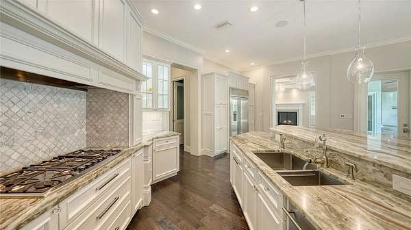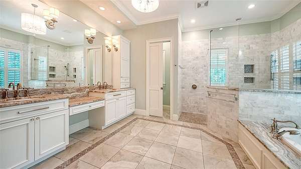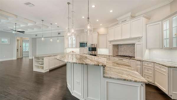 - Built-In Features, Ceiling Fans(s), Central Vaccum, Coffered Ceiling(s), Crown Molding, Eat-In Kitchen, Elevator, High Ceilings, Kitchen/Family Room Combo, Living Room/Dining Room Combo, Open Floorplan, Primary Bedroom Main Floor, Stone Counters, Walk-In Closet(s), Window Treatments