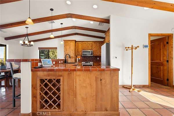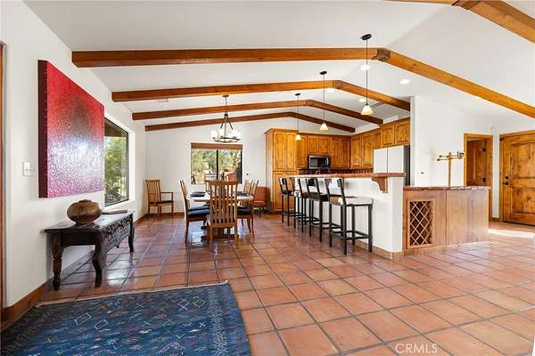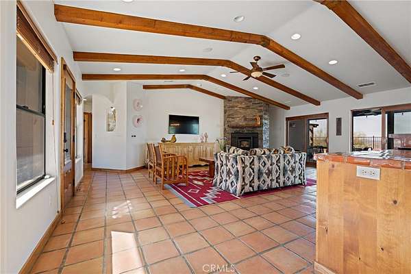 From the moment you arrive, mature landscaping and iconic Joshua Trees frame the property, while saguaro cacti and curated garden spaces create a setting that feels both intentional and inspiring. Inside, Spanish tile flows throughout the home, complemented by exposed beams, a warm fireplace in the living room, and an effortless feng shui that makes the space feel balanced and inviting. The kitchen offers generous prep space and seamless indoor dining and entertaining areas designed for gathering.