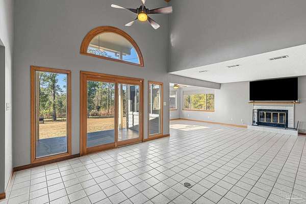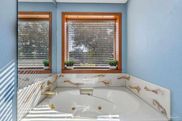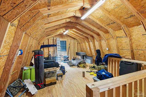ASSUMABLE MORTGAGE AVAILABLE! Qualified buyers may assume the current loan balance at a lower-than-market interest rate. Call for details. Tucked away on 2.05 landscaped acres in Spanish Oak Manor, this move-in ready 3BR/2.5BA home offers 2,852 SF of Southern charm, space, and calm--while keeping Pensacola conveniences close by. A welcoming full-length front porch and circular drive with a fountain centerpiece lead into a dramatic, light-filled atrium with soaring ceilings, a sweeping staircase, and French doors to the patio. Picture windows across the back of the home frame serene views of the expansive yard and visiting wildlife. The heart of the home is an expansive kitchen featuring a large granite-topped island, abundant cabinetry, stainless steel appliances, and a sunny breakfast room wrapped in windows with warm brick-paver floors. The living room centers around a cozy fireplace, perfect for gathering. Upstairs, a loft/office overlooks the atrium and showcases beautiful custom stained-glass detail. Downstairs, a generous bonus room can easily be repurposed as a 4th bedroom, home office, or flex space. The private primary suite is thoughtfully set apart and offers a long dual-sink vanity, jetted tub, and separate shower. Hardwood, tile, and brick-paver flooring throughout add warmth and character. Outside, enjoy room to roam beneath mature trees, along with a well and sprinkler system supporting established landscaping. An oversized garage/workshop with built-in storage and a 2-story 16x24 storage building with electricity provide excellent space for tools, hobbies, and projects. Conveniently located approx. 5 miles to I-10, 9 miles to Navy Federal's campus, 15 miles to Downtown Pensacola and Palafox Street, approx. 20 miles to NAS Pensacola, and about 23-26 miles to Perdido Key and Pensacola beaches.