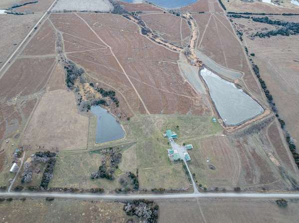 The centerpiece of the property is the barndominium-style main lodge, thoughtfully designed for both comfort and functionality. A large garage with concrete floors, dual drains, overhead doors, a wall-mounted TV, lockers, and laundry facilities welcomes you inside. From here, a sliding metal door opens into a 25? x 35? hunter's lounge, featuring barnwood walls, a wood-burning stove, leather couches, a full bar with sink and beverage cooler, and a convenient half bath. The garage also connects directly to the main living quarters, where you'll find a spacious kitchen and living room anchored by a stone fireplace with wood stove, and access to two outdoor entertaining areas: a 33? x 33? partially covered concrete patio with firepit overlooking the 3 +/- acre pond, and a 28? x 24? east-facing patio with a built-in concrete grill and dining bench overlooking the 1.75 +/- acre pond. The main lodge includes a master suite with full bath, two guest bedrooms, and an additional full guest bathroom.