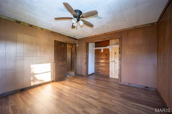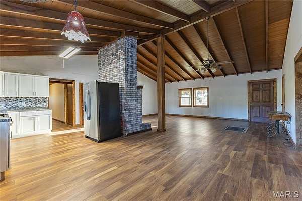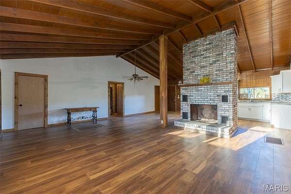 The home has been recently remodeled and showcases vaulted ceilings and a floor-to-ceiling stone fireplace that serves as the warm centerpiece between the kitchen and living room. Nestled on 15.3 acres down a quiet country road, the property is mostly pasture and fenced on three sides, making it ideal for livestock or hobby farming.
