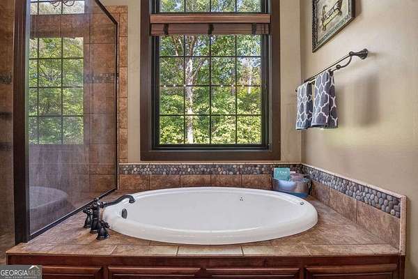 - Beamed Ceilings, Double Vanity, High Ceilings, Master On Main Level, Separate Shower, Soaking Tub, Tile Bath, Tray Ceiling(s), Walk-In Closet(s)