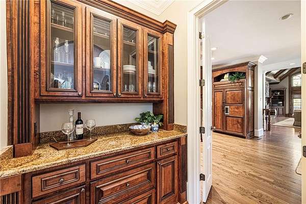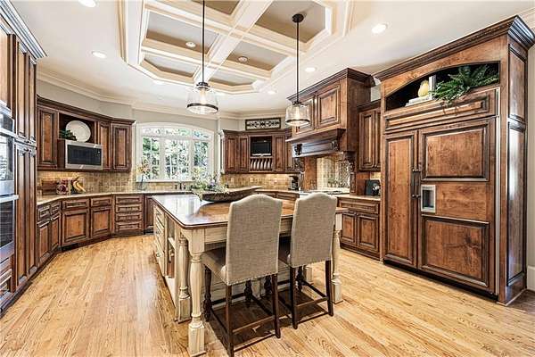 Inside, a richly paneled study, sweeping curved staircase, and elegant dining room set a sophisticated tone. At the center of the home, the chef's kitchen features a handsome butcher block island, stained cabinetry, and granite counters. The adjoining breakfast nook, warmed by one of five fireplaces, flows seamlessly into the keeping and living rooms, each offering comfort and connection. Thoughtful details include two powder rooms, dual staircases, and permanent attic stairs for easy storage.