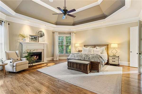 The main-level primary suite provides a serene retreat with a sitting area and fireplace, custom closet system, and spa-like bath with steam shower. Direct access to the terrace-level gym adds a private wellness element. Upstairs, spacious secondary bedrooms include walk-in closets with built-ins.