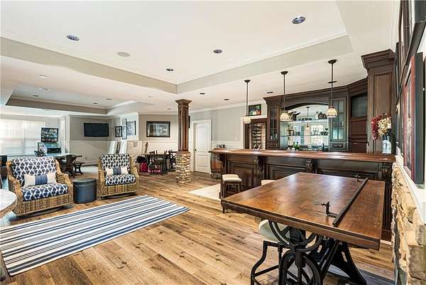 The daylight terrace level is designed for entertaining and extended living, offering a guest suite, theater, billiards room, gym, bar, and temperature-controlled wine cellar--all opening to the backyard oasis. Above the garage, a large unfinished space with a private entrance is ideal for a second office, guest quarters, or studio.