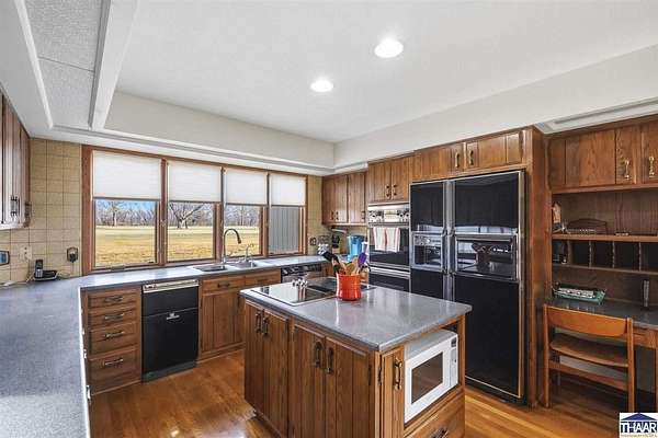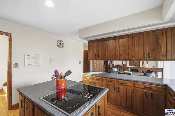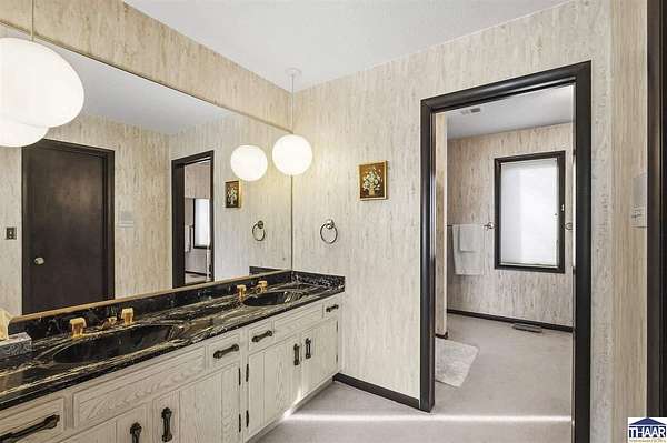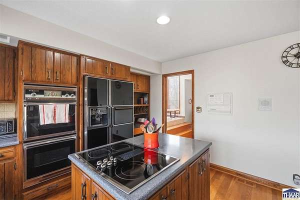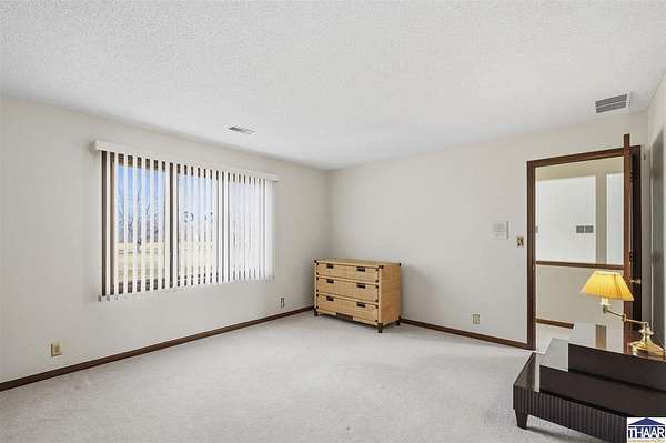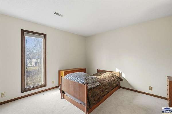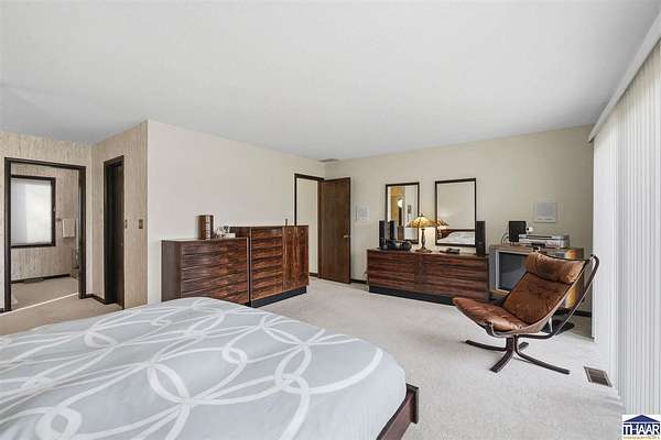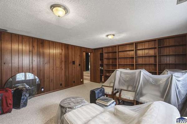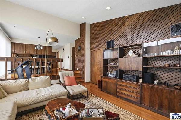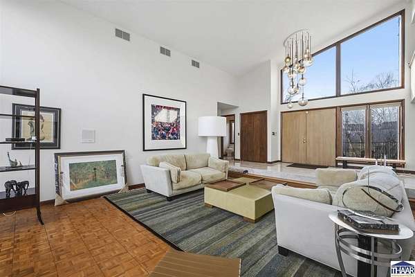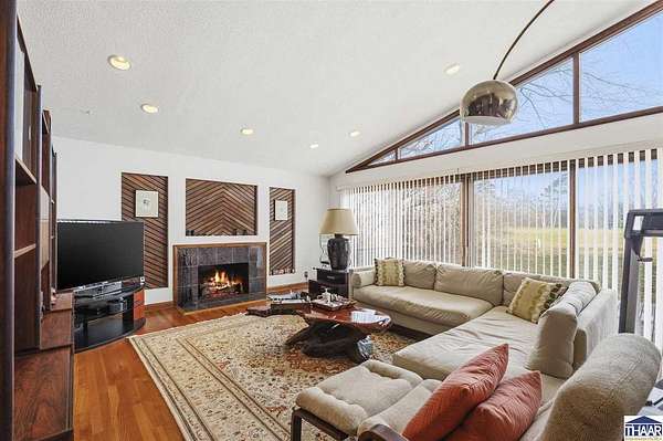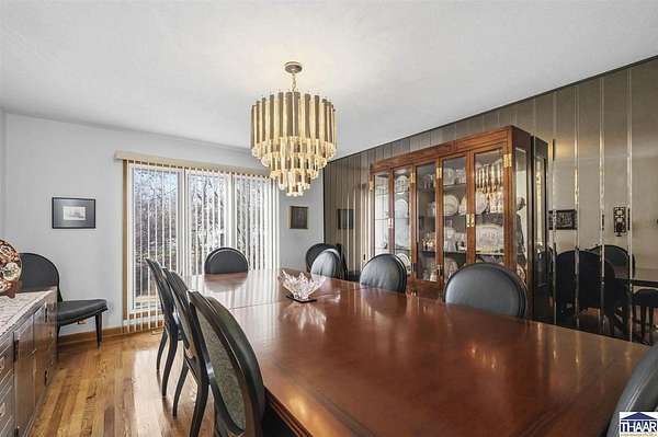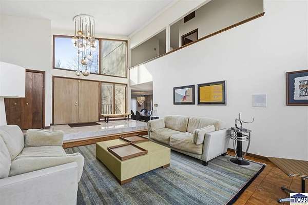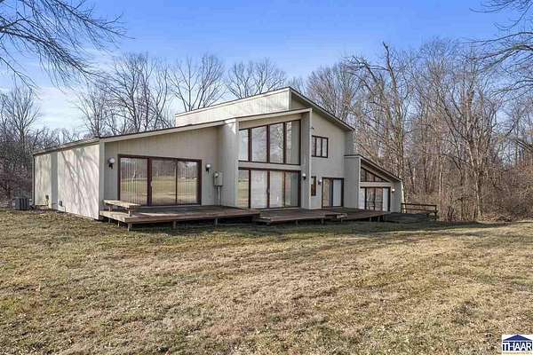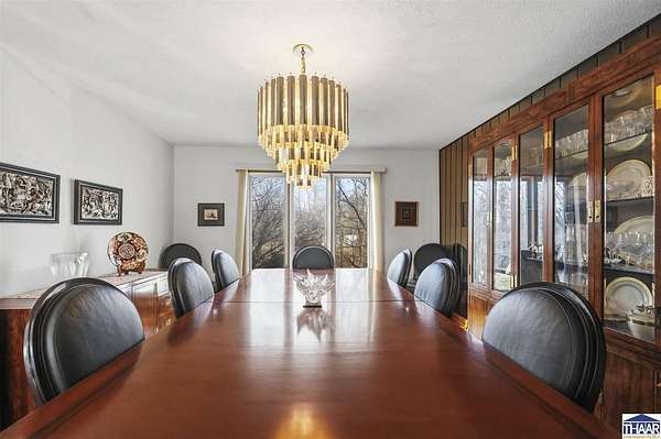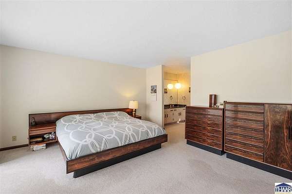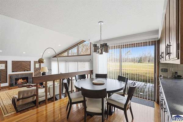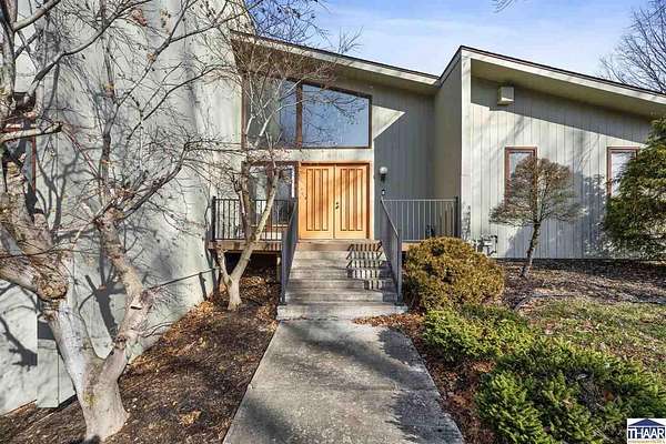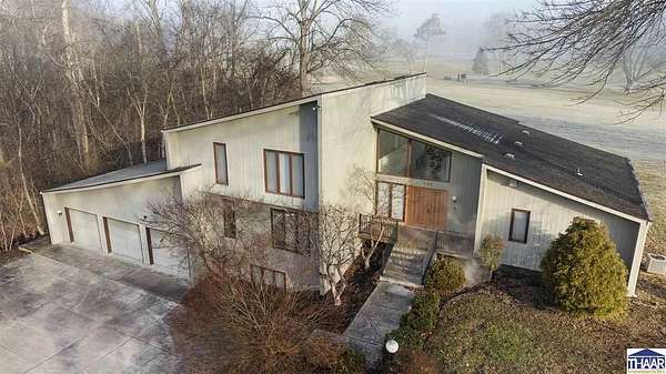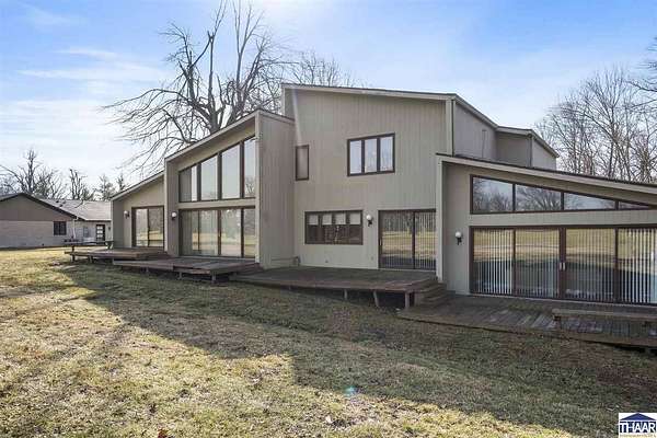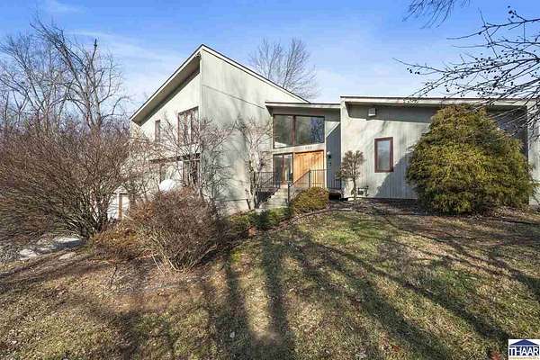 Homes on the 14th hole of the Country Club of Terre Haute Golf Course are rarely available, and this 4,292 sq ft mid-century contemporary in Woodgate is a special opportunity. Tucked on a private hilltop at the back of the neighborhood, it offers a peaceful setting with golf course views from multiple rooms. The two-story living room, kitchen, sunken family room, and main-level primary suite all feature floor-to-ceiling windows that bring in natural light and frame the scenery. Warm wood floors, clean lines, and original mid-century details give the home character and charm. A wood-paneled library makes an ideal work-from-home office, and the lower-level game room with fireplace and inglenook is perfect for relaxing or entertaining. Lovingly owned by the same family since 1972, this property is ready for its next chapter on the golf course.