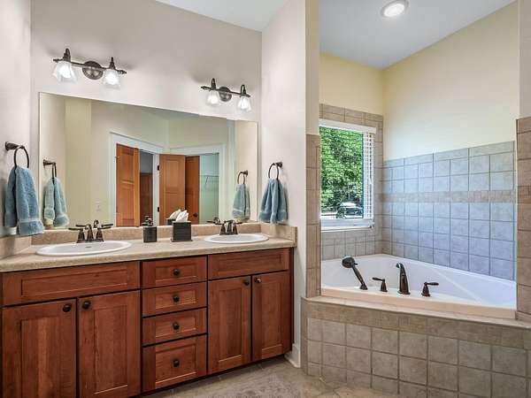 - Entrance Foyer, Garden Tub Roman Tub, High Ceilings, Pantry, Primary Downstairs, Split Bedrooms, Stall Shower, Walk In Closets