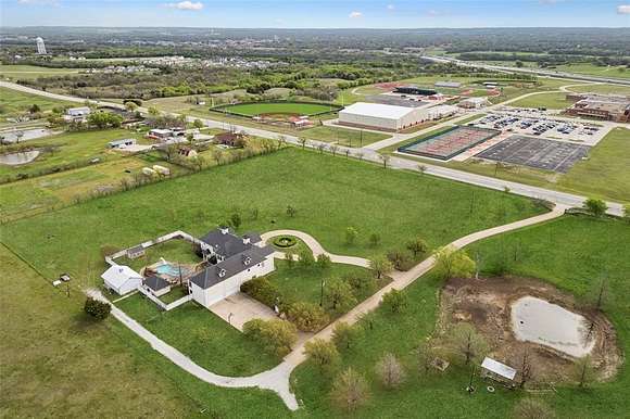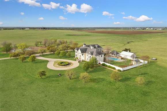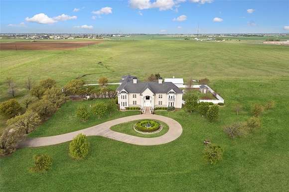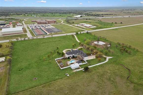 Nestled behind an electric security gate on an expansive 11-acre lot, this breathtaking Georgian-style estate offers unparalleled privacy & elegance in the heart of Gainesville. The backyard is a true retreat, featuring a stunning rock waterfall cascading into a sparkling pool. An expansive patio, complete w-a full outdoor kitchen & bar area, is perfect for year-round entertaining--ideal for hosting guests w-a bartender setup. Dual staircases lead to a serene private retreat. Step inside to a grand entryway w-soaring ceilings & a graceful winding staircase. Formal dining room exudes elegance, boasting a crystal chandelier, custom built-ins & a warming fireplace. A sunlit breakfast room w-double-height ceilings creates a bright & inviting atmosphere. Designed for entertaining, the massive game room features a cozy fireplace, ample space for pool & gaming tables + a wet bar. Generously sized guest bedrooms each include en-suite baths, ensuring comfort & privacy. The chef's kitchen is beautifully appointed w-an island topped in granite, a built-in refrigerator, an electric cooktop with a vent + plenty of cabinetry. A spacious utility room provides additional storage & room for an extra refrigerator. For added versatility, the home includes a basement--ideal for a wine cellar or a safe haven during Texas storms. The luxurious primary suite is truly impressive, featuring a private sitting area with a fireplace, and a coffee bar. The spa-like en-suite bath includes an oversized walk-in closet. A stately library lined with custom bookshelves adds a refined touch, while an elevator provides easy access to all levels. Additional features include a four-car garage and a 24x32 workshop, perfect for weekend projects. Just steps away, a stocked pond with a dock offers a tranquil escape. With over 9,000 square feet of living space, this estate is not only a dream home but also an incredible investment opportunity--perfect as a luxurious bed and breakfast, wedding venue, or Airbnb.