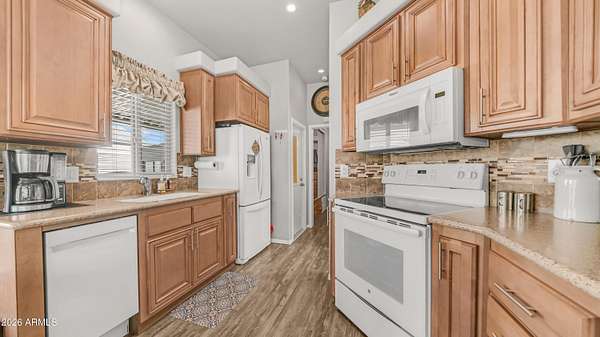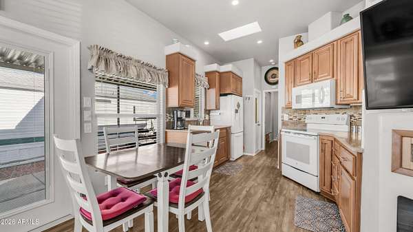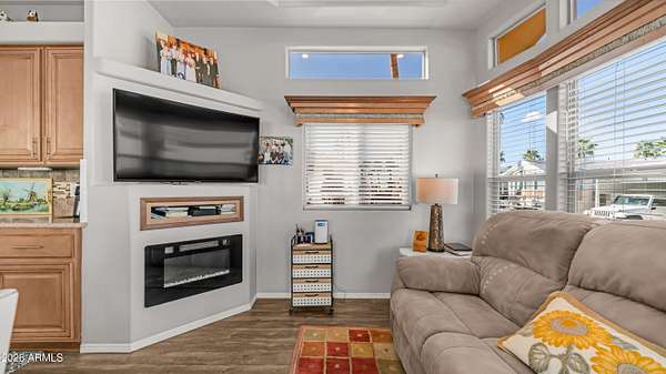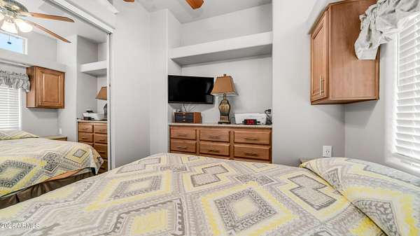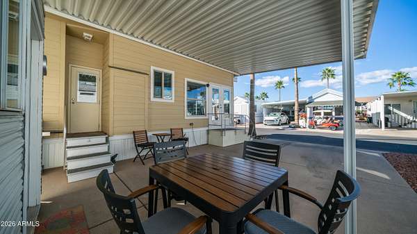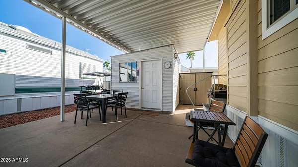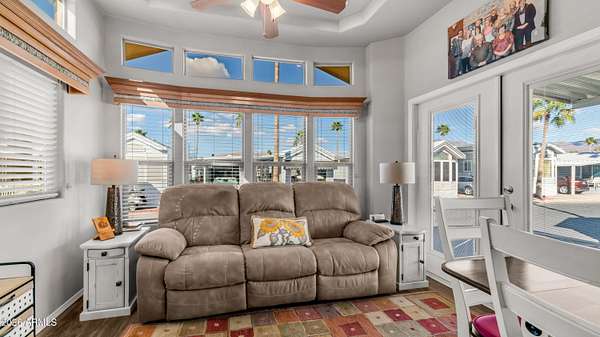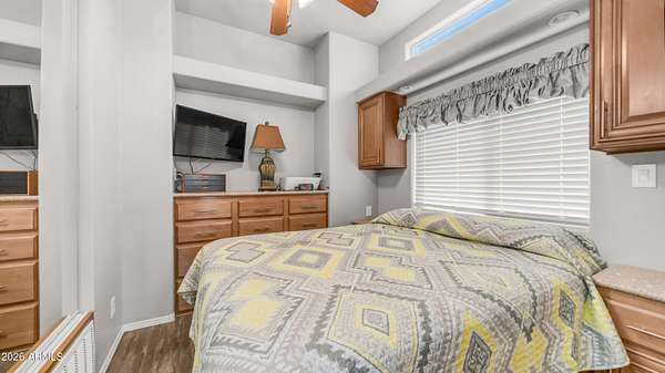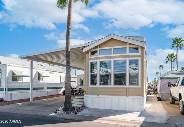 Step into this beautifully updated 2020 built home that still feels practically brand new, where the fresh finishes & modern design have barely been lived in. As you arrive you are welcomed by stunning mountain views from this desirable north facing property, with windows placed high & low throughout to flood the home with natural light. Inside, soaring ceilings enhance the bright open concept layout, creating an inviting space that blends style & functionality for everyday living or entertaining. The full tape & textured drywall finish adds a polished touch, while solid surface flooring runs throughout with no carpet in sight. The kitchen is fully equipped with a full size stove, dishwasher, french door refrigerator, microwave, & everything you need to start enjoying immediately. The bedroom offers excellent storage along with a queen size bed, & the bathroom features a spacious walk in shower, generous counter space, & abundant cabinetry so there is no stepping over a tub. Step outside to appreciate the extra high carport that provides excellent parking for vehicles of nearly any size. When guests arrive, you have options with a flexible bonus room that can serve as additional sleeping space, hobby room, workshop, or whatever fits your needs, complete with a convenient half bath & washer & dryer, a rare & highly desirable feature that makes hosting effortless. All of this is located in the active 55 plus community of Golden Vista where you own the land & enjoy endless clubs, groups, amenities, & activities that make every day feel like a celebration with something new to experience around every corner.