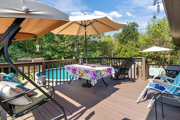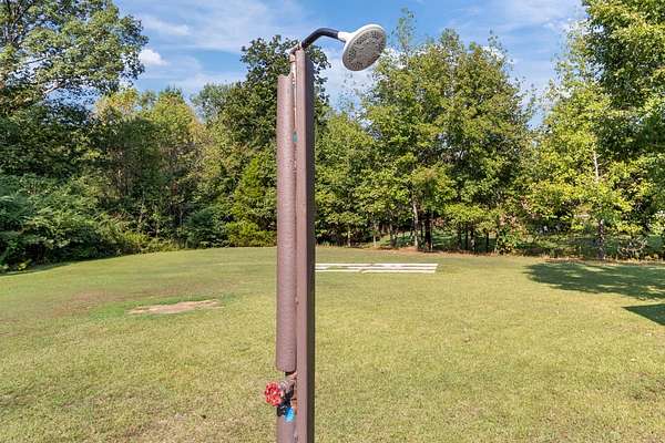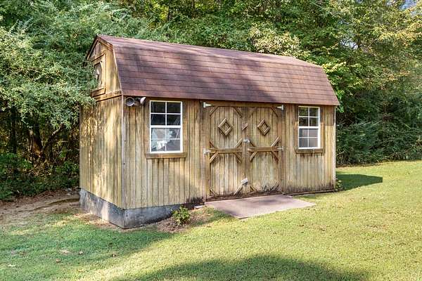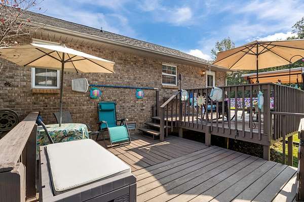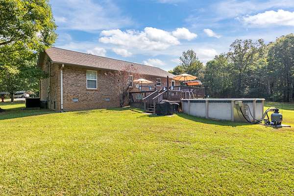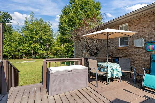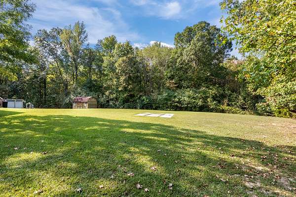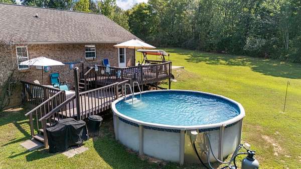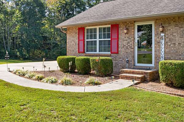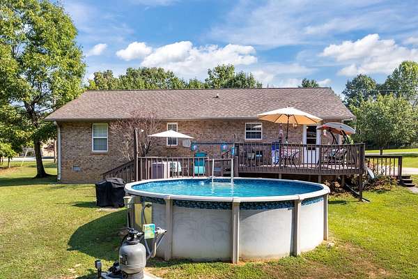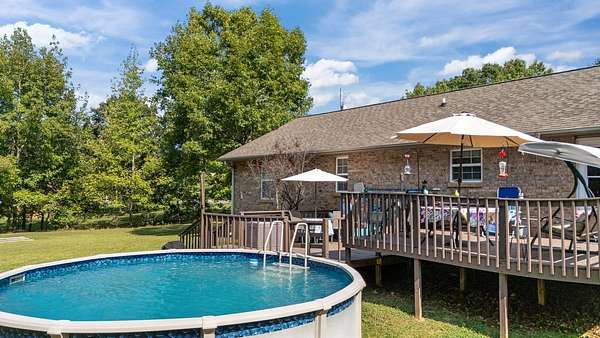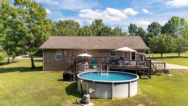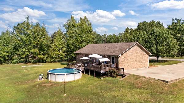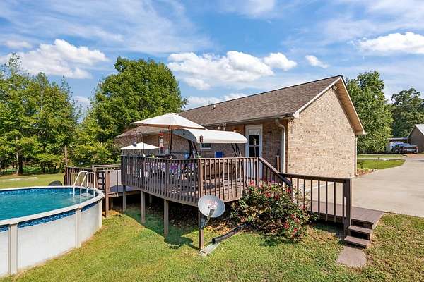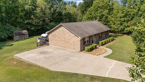 PARK-LIKE 1.69 ACRE PARADISE WITH A POOL - Charming curb appeal makes a stunning first impression. Well maintained home & grounds near the end of a quiet cul-de-sac. One-level living with waterproof laminate & ceramic tile flooring throughout. Primary bedroom provides a walk-in closet, double vanities & an oversized shower. Generous guest bedrooms each have spacious closets & access to a full hall bath. Open living area with lots of natural light from multiple windows. Eat-in kitchen with loads of cabinets storage & a large dining area. New 50 gallon water heater. Lovely lot lined with beautiful bradford pears in the front. Wooded back & side yard for ultimate peace and privacy. Take a walk to the rear of the property to a creek. Lounge on the tiered deck and watch the hummingbirds. Enjoy the outdoor shower after taking a swim. 10x16 storage building with electric & ramp for your lawnmower. Wide concrete drive for side by side parking. Lush landscape with shapely shrubs, hardy hostas & monkey grass. Natural gas is available at the road. Convenient to schools, shopping, Pebble Isle Marina & multiple boat ramps on the Tennessee River/Kentucky Lake.