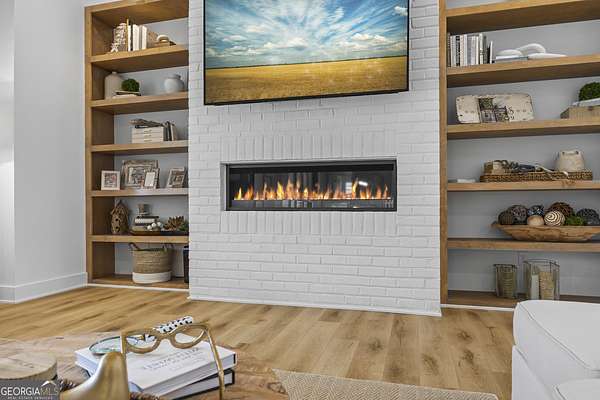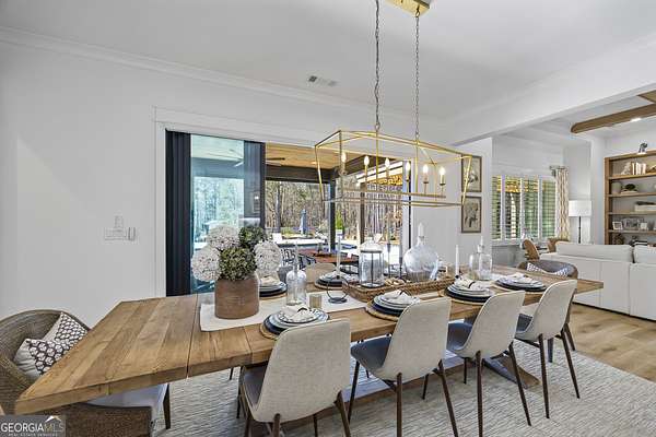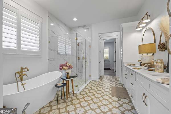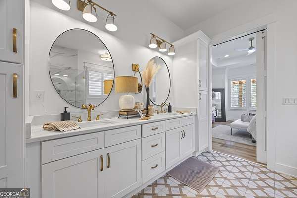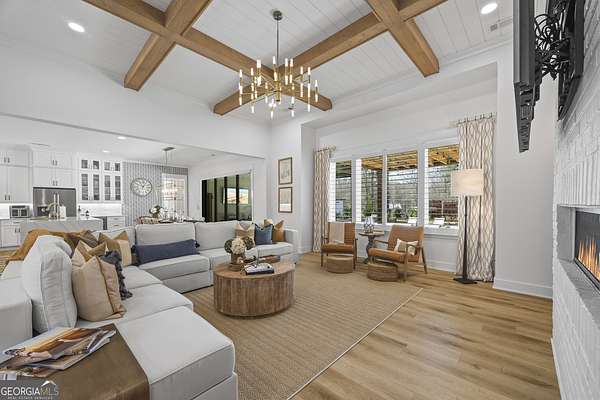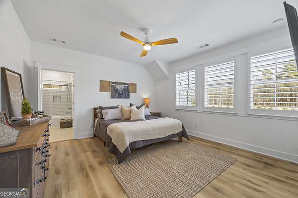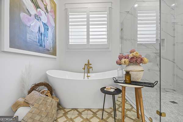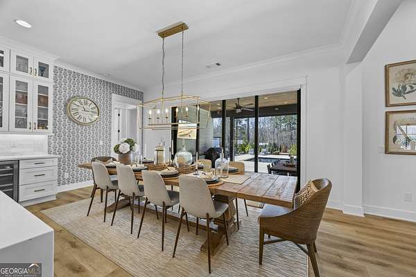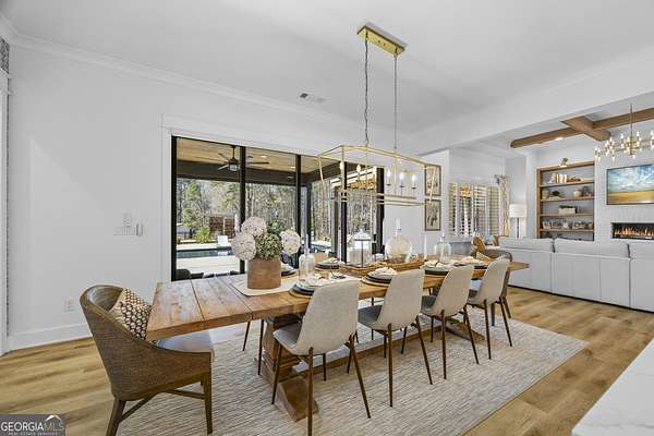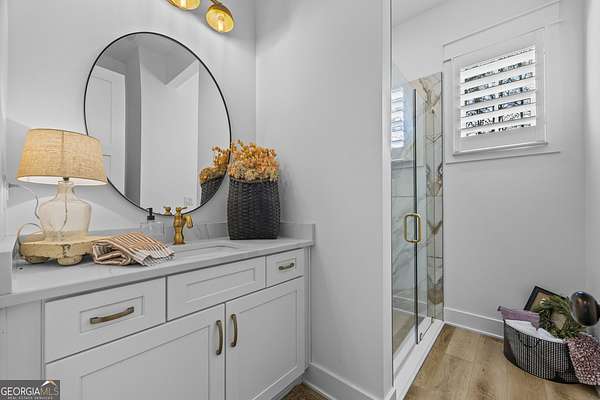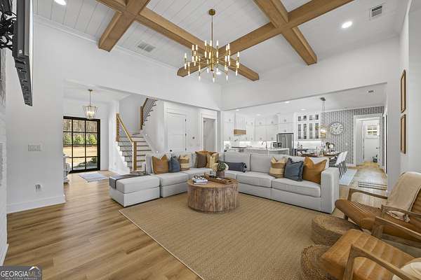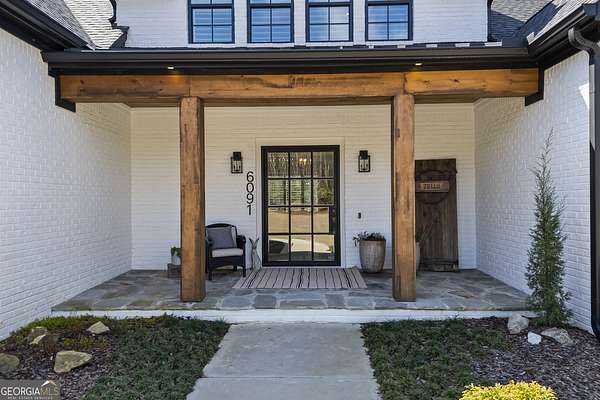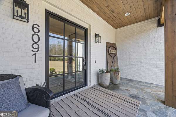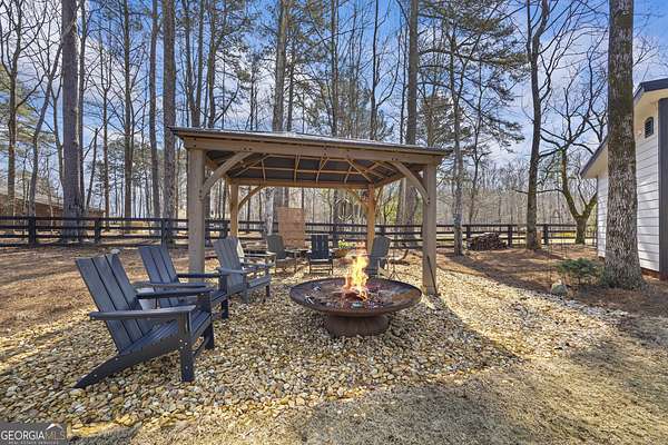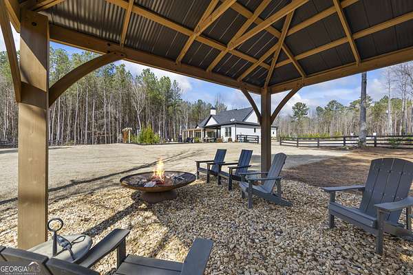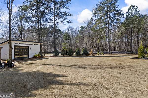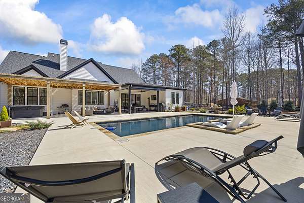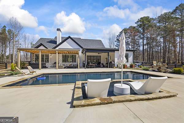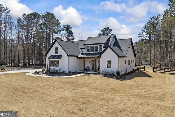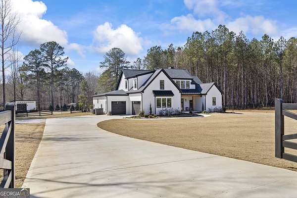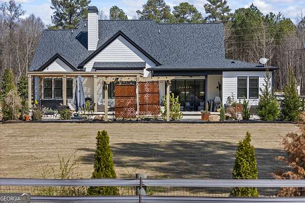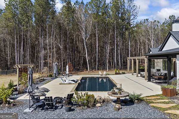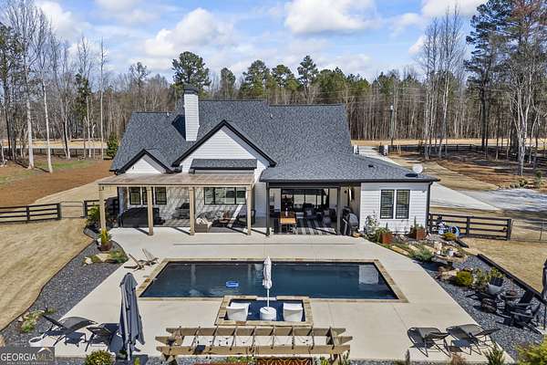 Situated on 2 acres, this better-than-new modern farmhouse with a saltwater pool is a rare opportunity in the North Oconee School District. From the gated entry, the white brick facade with striking black accents welcomes you to a charming front porch featuring a tongue-and-groove ceiling, stone flooring, and custom wood headers and columns. A showstopping full-glass 5' pivot front door sets the tone as you step into the foyer. Luxury plank flooring and plantation shutters extend throughout the entire home. Designed with entertaining and comfort in mind, the open-concept living room features coffered ceilings with tongue-and-groove detailing and a dramatic floor-to-ceiling brick fireplace flanked by built-in bookcases. Adjacent to the living room, the gourmet kitchen is a true showpiece, boasting a large island with waterfall quartz countertops, ZLINE stainless steel appliances, tile backsplash, large basin sink, and a spacious walk-in pantry. The dining area offers ample space for gatherings and features a multi-slide patio door leading to the covered outdoor living area. The owner's suite is a luxurious main-level retreat featuring a tray ceiling, stylish accent wall, expansive custom walk-in closet, and a spa-like en-suite bath with dual vanities, a tiled shower, and a freestanding soaking tub. The laundry room, complete with built-in cabinetry and a utility sink, is conveniently accessible from both the owner's suite and the hallway. A secondary bedroom and full bathroom are also located on the main floor. Upstairs you'll find a bedroom with its own en-suite bathroom, another secondary bedroom, a bonus room or fifth bedroom, and an additional full bathroom. Outdoor living is just as impressive, with an extended covered patio overlooking the stunning in-ground saltwater pool with sundeck and powered shades. A covered pergola fire pit area sits beside the pool house, which is fully finished with power, a mini-split system, and a custom full-glass garage door, perfect for enjoying football nights by the fire. The pool house also includes a convenient storage room. Additional features include a three-car garage, an extended parking pad, a fully fenced property with the front yard partitioned from the backyard, and a sprinkler system that covers the entire yard. The upgraded landscaping and outdoor lighting create a breathtaking setting, especially at night. This one-of-a-kind property combines private, upscale living while remaining within easy reach of Monroe, Athens, and Watkinsville for shopping, dining, and entertainment.