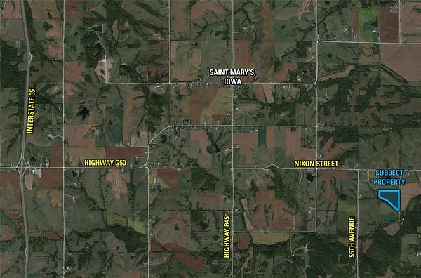 Presenting this 25-acre m/l building site and hobby farm located on dead-end, 60th Avenue, just southeast of St. Marys, Iowa. Ideally positioned in rural Warren County, the property offers peaceful country living with the convenience of being less than 30 minutes from the Des Moines Metro. Its close proximity to Interstate 35 makes commuting effortless while preserving the opportunity for a rural lifestyle. This property showcases stunning views of Iowa's rolling countryside, native grass habitat, rich farmland, and abundant wildlife. Whether you're envisioning a custom home or a hobby farm, the setting provides the perfect backdrop. Located within the Interstate 35 Community School District and just two miles from St. Marys, this tract combines rural Iowa with everyday convenience. The property is located only 1/2 mile east of Lake George and the St. Marys Rod & Gun Club. The site is turnkey and includes access to essential utilities such as Warren Rural Water (needs extended from the north), Clarke Electric Cooperative, and multiple high-speed internet options. The gently rolling topography accommodates a variety of building site options, including walkout, daylight, and flat layouts. The entirety of the property is currently enrolled in CRP program CP42 paying $229.65/acre or $5,741.25 annually through 2026, creating a diverse and attractive landscape while offering privacy and a natural buffer from neighboring properties. Visit our website for more Information.