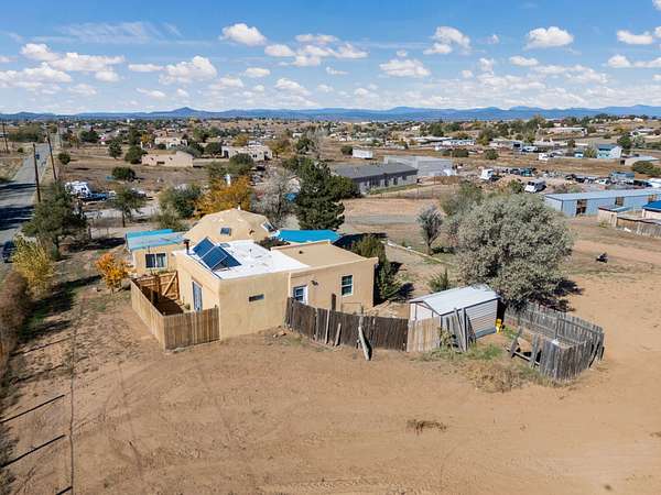 Welcome to your own slice of the Southwest - a 1,664-square-foot largely adobe home built around a one-of-a-kind geodesic dome, full of character and heart. Set on 2.5 peaceful acres with sweeping Sangre de Cristo mountain views, this property offers the best of rural living, combining comfort, sustainability, and the beauty of the high desert. Step inside and feel the warmth of handcrafted adobe walls, the wooden geodesic dome, exposed vigas, and natural wood and Saltillo tile floors. The primary bedroom features a corner kiva fireplace, creating the perfect cozy retreat on cool evenings. The spacious kitchen is well equipped with stainless steel appliances and plenty of room for gathering, cooking, and sharing meals made from your own garden bounty. The home stays comfortable year-round with a mini-split, woodstove, and solar hot water, while a greywater irrigation system helps nourish your land. Outside, you'll find everything you need for a working mini-ranch or hobby farm - stables for eight horses with water and electricity, an arena, and ample storage for tack, tools, and feed. The private well ensures reliable water, and there's space to expand your gardens or add more animal pens. Currently, the homestead is happily shared with turkeys, chickens, and mini goats, all thriving under the wide New Mexico sky. This property isn't just a home - it's a lifestyle. A peaceful haven where you can slow down, breathe deep, and live in rhythm with the land.