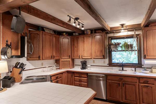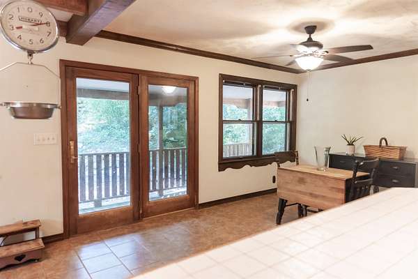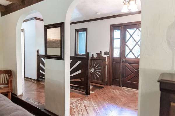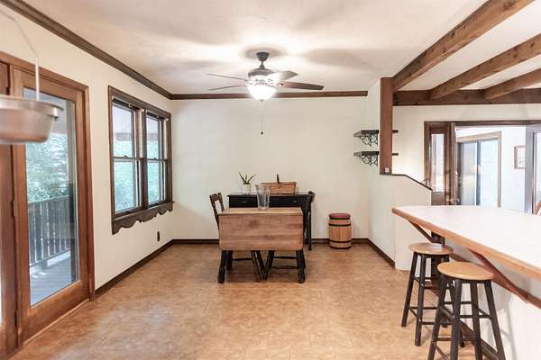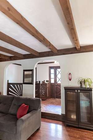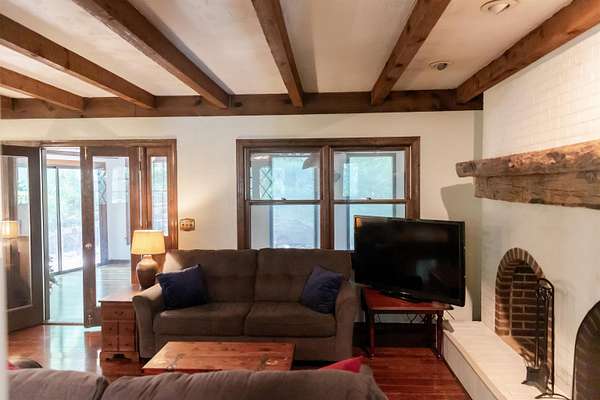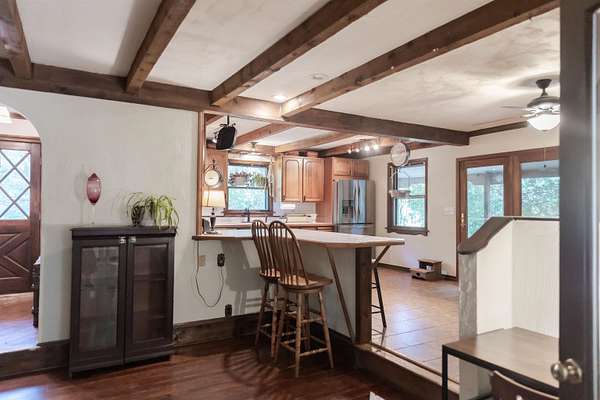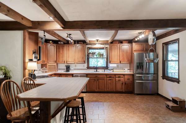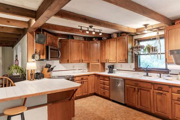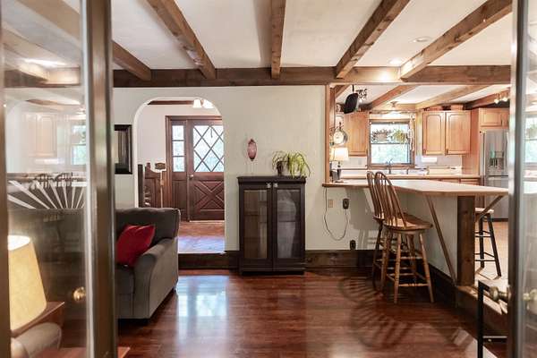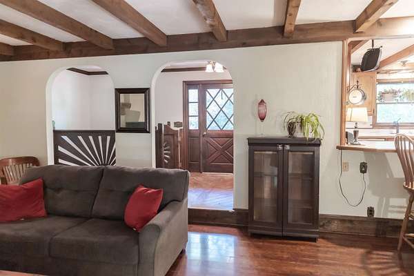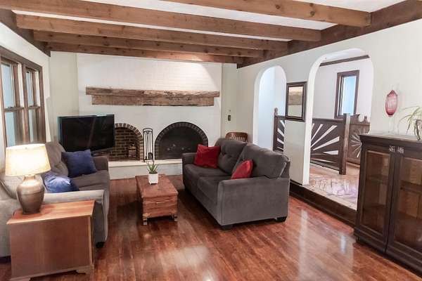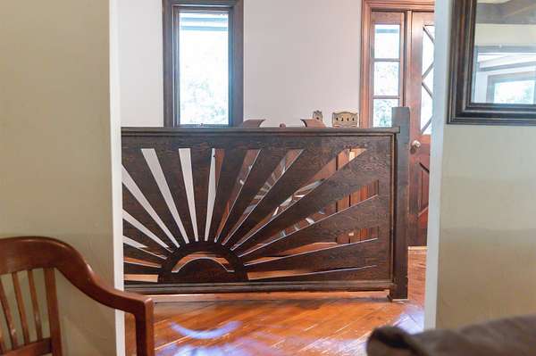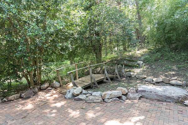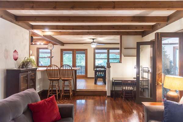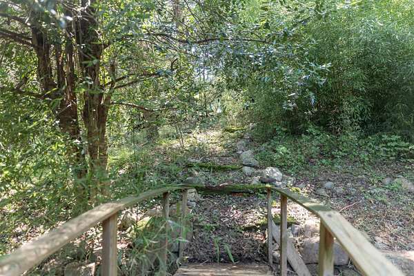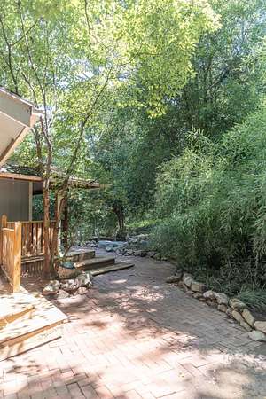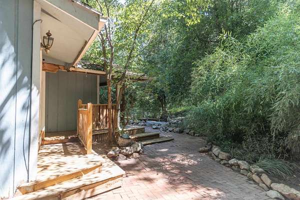 Tucked away on over 3 peaceful acres, this one-of-a-kind 3-bedroom, 3-bathroom home is full of character and craftsmanship. From the moment you arrive, you'll notice unique custom details--like the stunning post and beam ceilings in the living room, rich wood trim, and artisan finishes throughout. The open and welcoming layout features warm hardwood floors, cozy gathering spaces, and a kitchen designed for entertaining. Step outside and explore multiple courtyard-style spaces, ideal for relaxing or hosting guests--including a whimsical wooden bridge and an outdoor pizza oven that makes this home truly unforgettable. Whether you're looking for privacy, convenience, or a lifestyle property with endless potential, this home offers it all--just minutes from town!