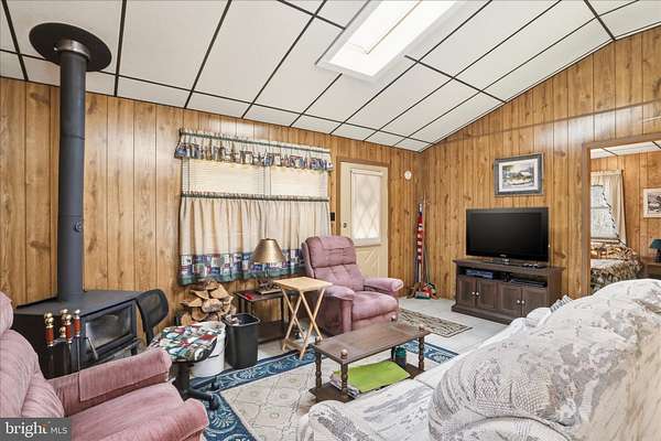 - Ceiling Fan(s), Combination Kitchen/Living, Dining Area, Entry Level Bedroom, Family Room Off Kitchen, Open Floor Plan, Skylight(s), Wood Stove
