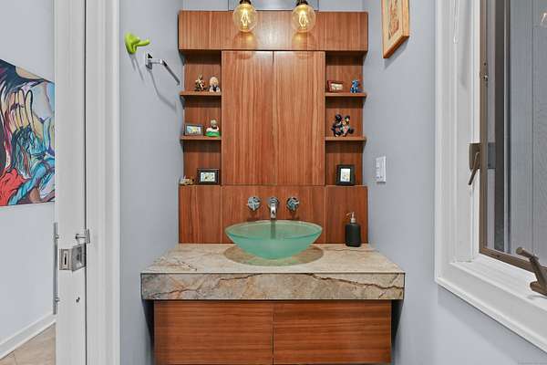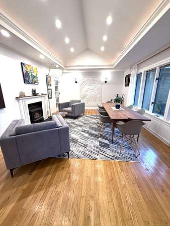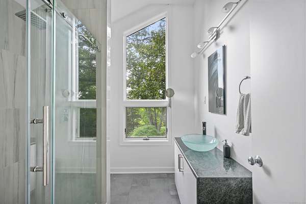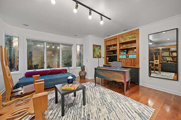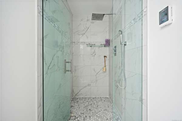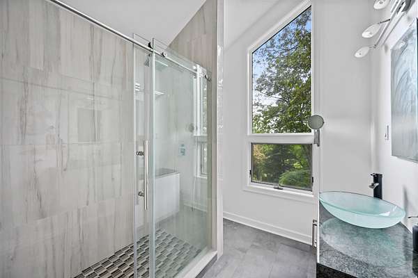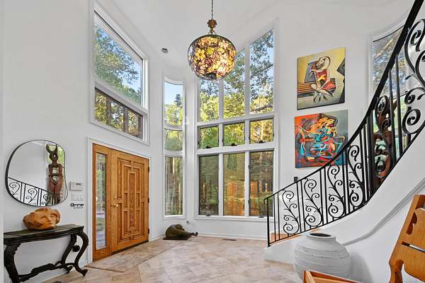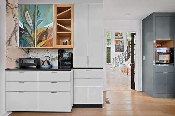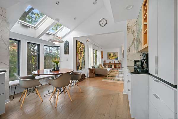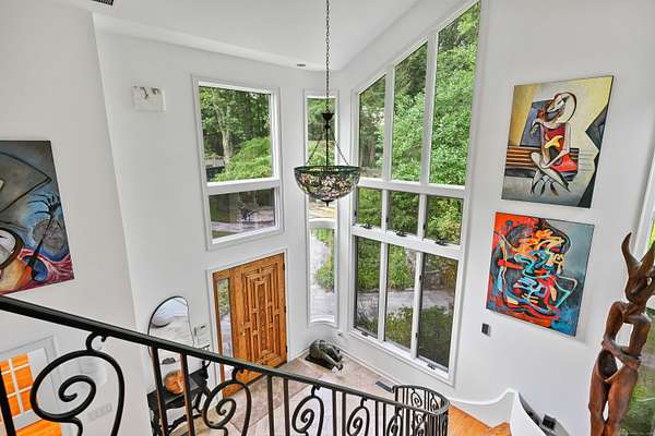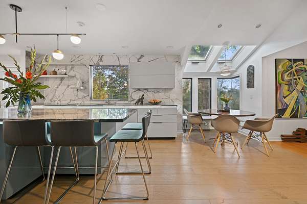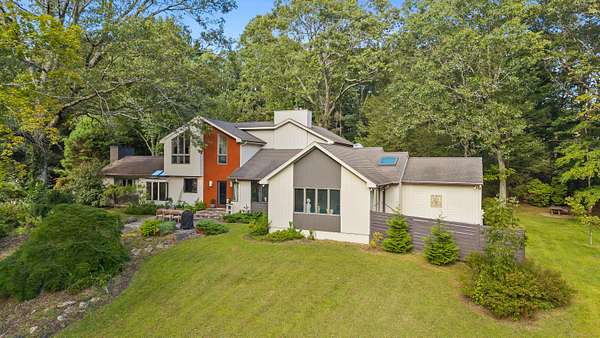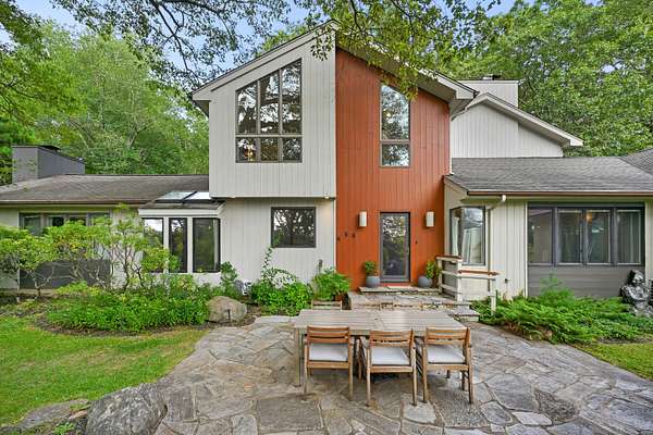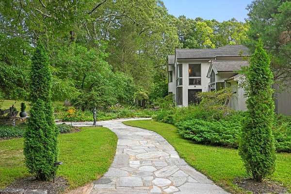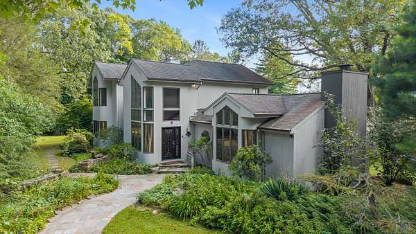 A celebrated artist's estate, this extraordinary mid-century modern residence is a statement of design and lifestyle. Gated and private on nearly four acres, the home opens with a dramatic foyer of soaring glass and a sweeping wrought-iron stair. Light cascades across gleaming hardwood floors and cathedral ceilings, where striking architectural lines create a gallery-like backdrop for living and entertaining. The vaulted living room, anchored by a sculptural fireplace, flows to a sleek chef's kitchen with lacquered maple cabinetry, bold granite counters, and professional Wolf, Bosch, and Sub-Zero appliances. A breakfast area and elegant dining room-complete with its own fireplace-offer refined spaces for gatherings of any scale. The main level also includes a rare guest or second primary suite with kitchenette and glamorous bath, plus a versatile office/bedroom with custom built-ins. Upstairs, the primary retreat impresses with vaulted ceilings, a walk-in closet, and spa bath, joined by an additional en-suite bedroom. The lower level surprises with a pub and recreation room. Beyond the interiors, manicured grounds feature curated gardens, meandering stone paths, and multiple destinations for leisure: an enclosed porch with sauna and Endless Pool, hot tub and firepit patio, greenhouse, vegetable garden, and chicken coop. A property of uncommon artistry and vision-seamlessly balancing luxury, sustainability, and serenity. Close to all commute routes to NYC and down county.