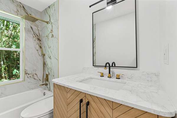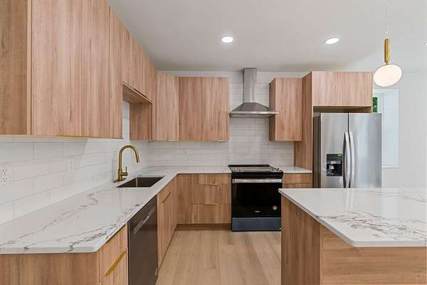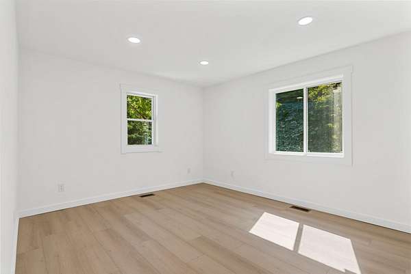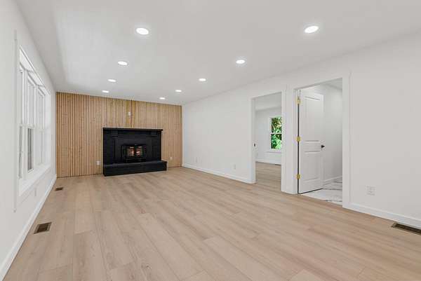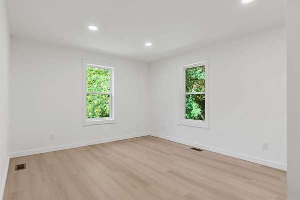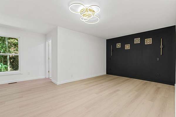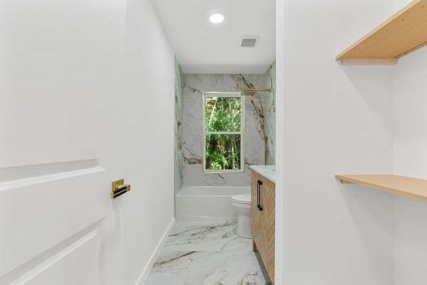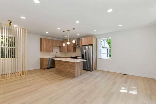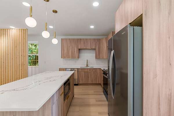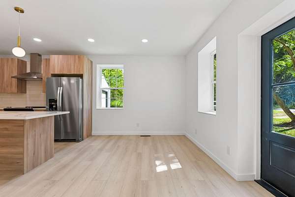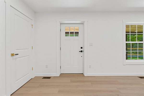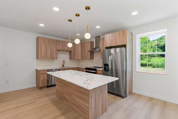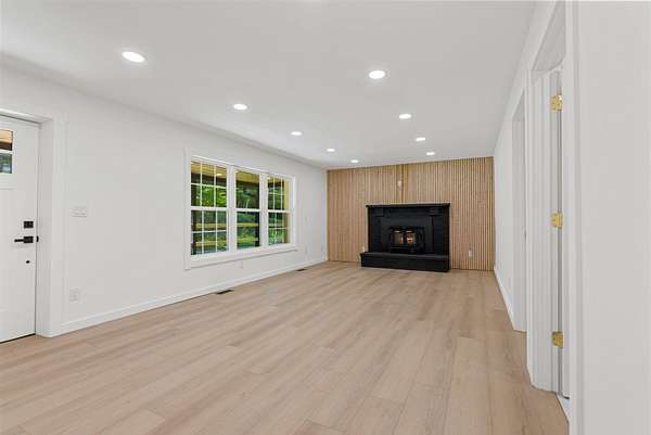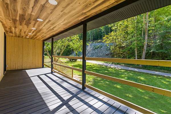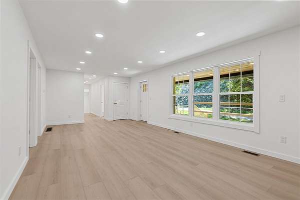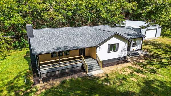 Nestled in a quiet area with lush trees, fresh air, and wildlife, it offers privacy while being just a short drive to local amenities. The home features new wiring, can lights, insulation, drywall, and a new roof. Inside, enjoy LVT 20mm scratch and waterproof flooring, quartz countertops, custom cabinets, and new appliances. The bathrooms have tiled showers with upgraded plumbing fixtures and hardware. Natural light fills the home through new windows, complemented by wood trim and fresh paint. A fully finished basement with an open floor plan adds extra living space. Outside, the brick exterior, Trex front porch, and new gutters enhance curb appeal. The new HVAC, updated ductwork, new water heater, and blown-in insulation ensure comfort and efficiency. A large detached garage/shop provides ample storage or project space. This charming home blends comfort, style, and nature in your private oasis! Discover your tranquil escape in this beautifully renovated home, perfect for a family residence or short-term rental.