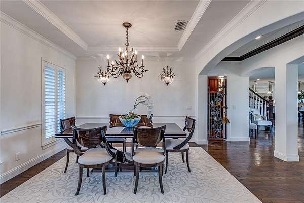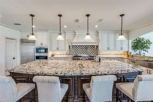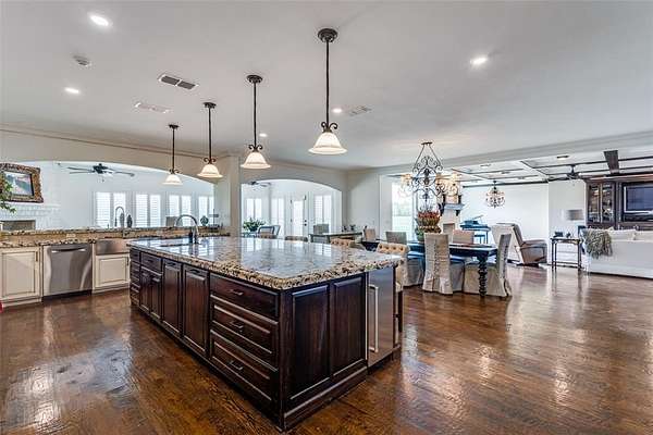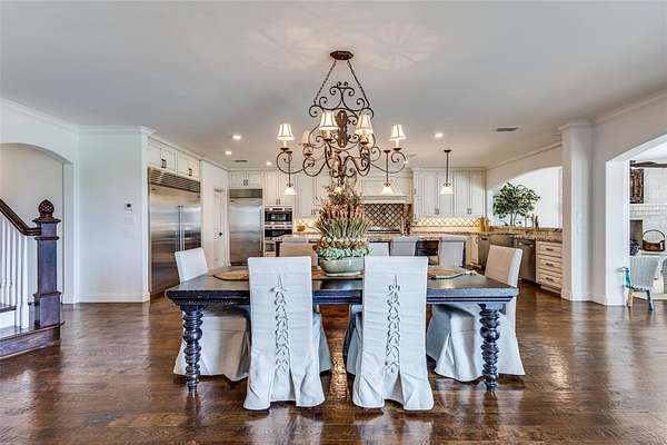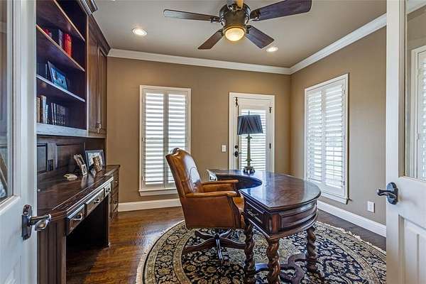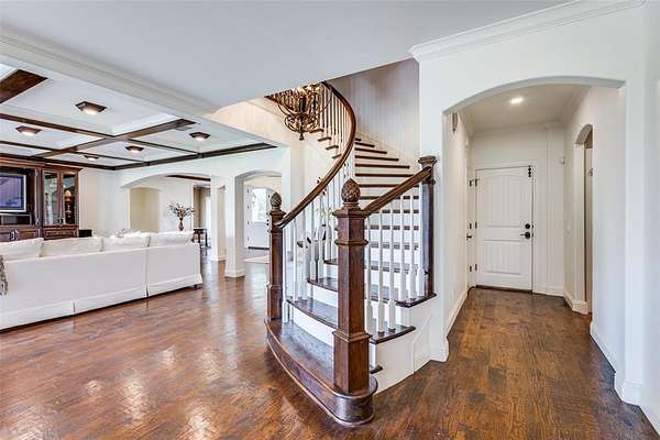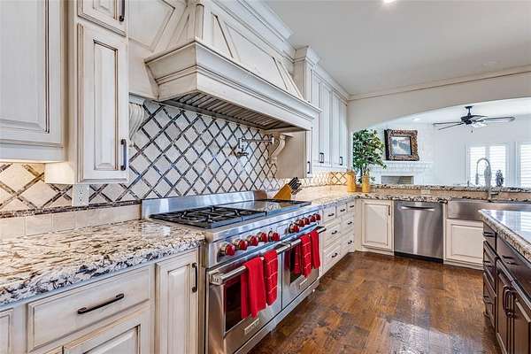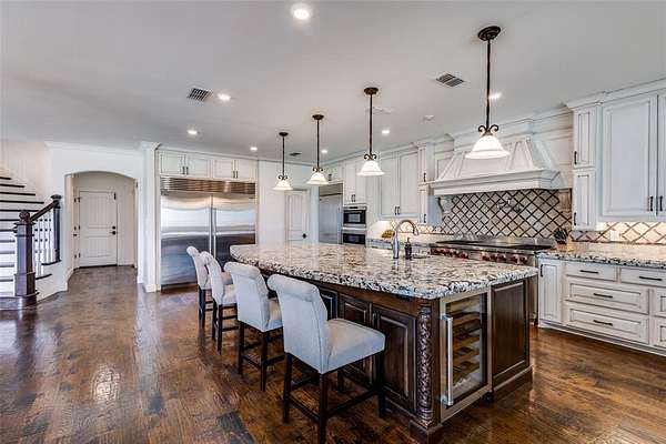 The grand entry welcomes you into an elegant and inviting interior featuring a formal sitting room, formal dining, and a spacious great room anchored by a stunning stone fireplace. The gourmet chef’s kitchen is a true showpiece, outfitted with premium Wolf appliances, multiple ovens, dual dishwashers, Sub-Zero refrigeration, an oversized island, and a well-appointed butler-style layout ideal for entertaining. A private office, wine cellar, secondary dining area, and large utility room with valet station add to the home’s thoughtful design. Natural light pours through expansive windows with plantation shutters, highlighting beautiful hand-scraped wood flooring.