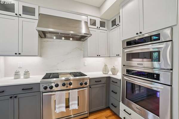 - Convection Oven, Dishwasher, Disposal, Double Oven, ENERGYSTAR Qualified Appliances, Free Standing Gas Range, Free Standing Refrigerator, Gas Appliances, Island, Microwave, Quartz