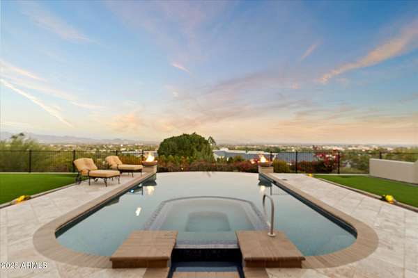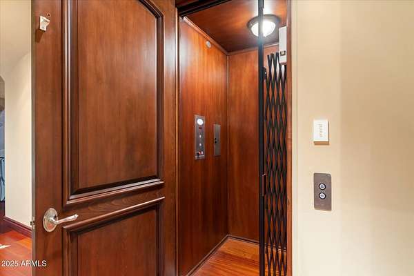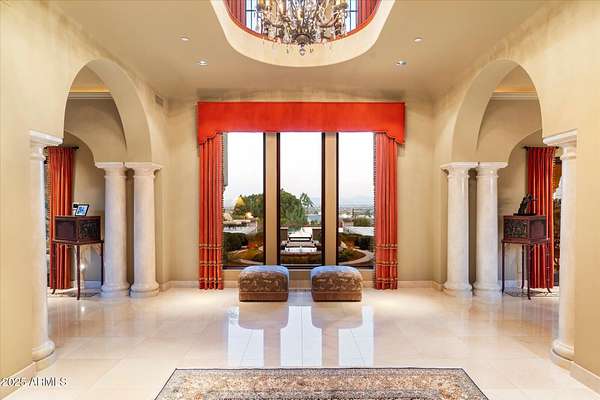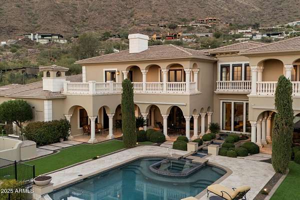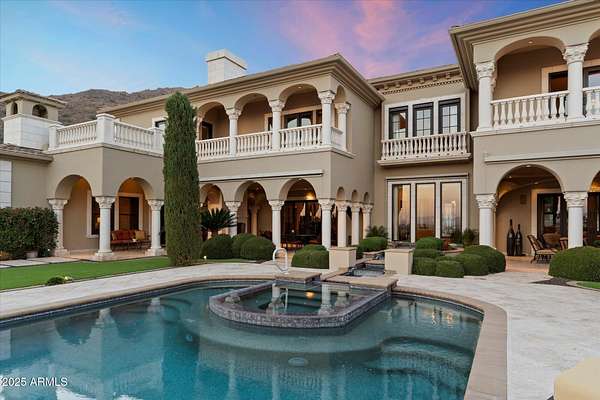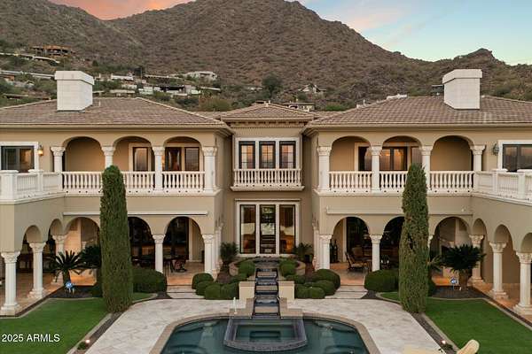 Bespoke Residence, on Camelback Mountain High above the valley on a signature street that breathes timeless elegance with every detail. Thoughtfully crafted, most recently inspected and tweaked, this gated trophy home offers privacy and panoramic views of both mountains and sweeping city lights. Situated on approximately 1.6 acres, occupies one of the most coveted setting on the street, featuring a large motor court for added convenience. The interior reflects exceptional craftsmanship, with exquisite finishes including marble, cherry, alder, and specialty granite throughout. Three beautifully designed powder rooms, hand-painted ceiling details in formal rooms, and a wine cellar enhance the home's aesthetic charm. Grandfather rights secured; this one-of-one home offers tremendous value!! A grand gallery hallway makes an impressive entry, leading to spaces like the Gentleman's Study and Billiard Room. A private elevator connects guests and residents to the second-floor suites. For wellness and relaxation, the oversized exercise room includes a wet bar and steam shower, adjacent to the luxurious primary suite, which features a hand-sculpted onyx tub and expansive His and Her closets, complete with built-in washers and dryers for added convenience. An 1,100 sq. ft. guest house ensures privacy and comfort for visitors. Set in tranquil surroundings with impeccable attention to design and function, this estate offers luxury and seclusion in one of Paradise Valley's finest locations. See our Motion Video!