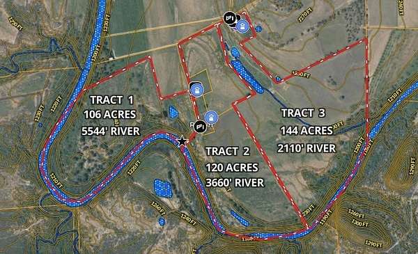 The land is fenced and cross-fenced and benefits from a current agricultural exemption, keeping property taxes low. Two homes, three water wells, and electricity to multiple locations offer immediate utility for those looking to build, ranch, or simply retreat. With a blend of open pasture and densely wooded river frontage, each tract offers its own unique charm and potential.