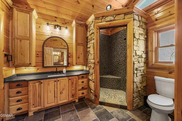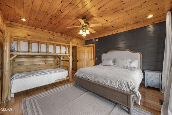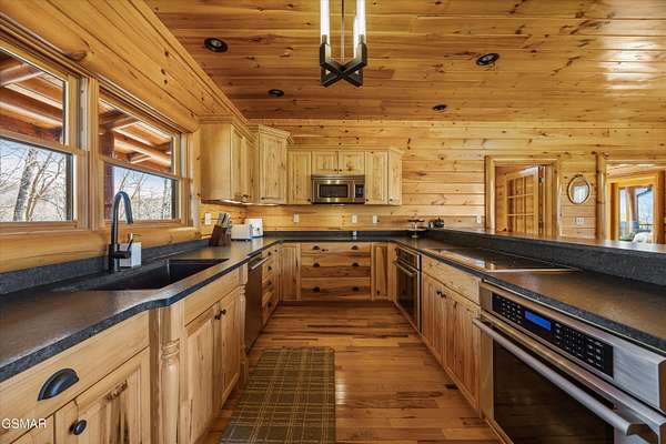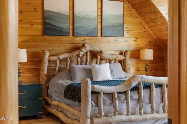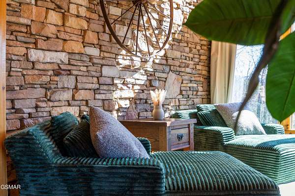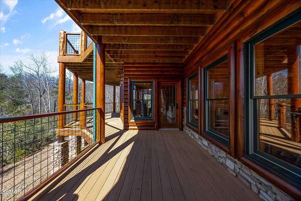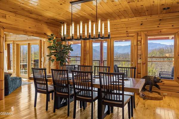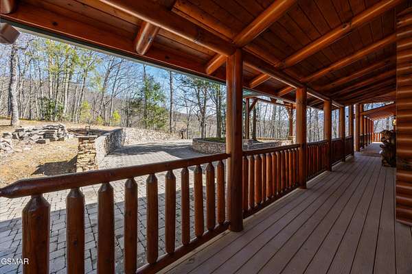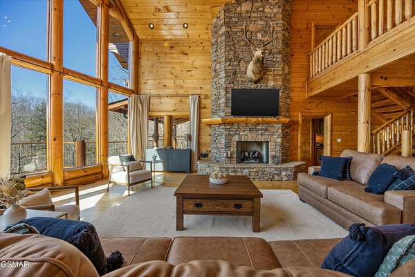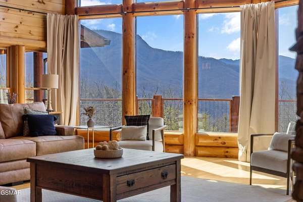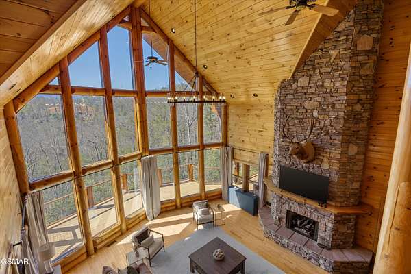 If one were to close their eyes and imagine the perfect Smoky Mountain luxury cabin, they would likely imagine something just like 611 Pinnacle Vista Road. This home is a unicorn, as there is nothing else like it on the market. They just don't build homes like this in the Gatlinburg area anymore, especially one like this that has epic views of the National Park and that sits on over 4 acres for true privacy. The cabin boasts over 5,000 square feet of living space over 3 levels, 4 bedrooms, 4.5 bathrooms, and outdoor decks on every level. This property has never been on a rental program before, and has recently undergone a dramatic renovation by its current owners to make it modernized for 2026. The home has been stained top to bottom, has recently had a new roof installed, and has just had all interior spaces (kitchen, bathrooms, lighting, etc.) completely refreshed and made beautiful. The cabin has always been a second home, but would also make a fantastic rental property or a full time residence. When you first arrive you will encounter the private and gated driveway entrance. The drive leading up to the property as well as the circular parking area are constructed of stone pavers for an elegant and tasteful first impression. The front entrance offers a covered portico parking area for rainy/snowy days, or alternatively the home offers an oversized two car garage for parking out of the elements. First impressions are everything, so walking in the front door you will first encounter the main living area which features a gigantic wall of glass facing the mountains of the National Park, a floor to ceiling stone fireplace, seating area with all new furnishings, and an oversized and elegant brand new chandelier. Adjacent is the open concept kitchen and dedicated dining area. The kitchen features all brand new high end appliances, an island/bar area with bar seating, full pantry, and access to the adjacent chefs pantry area for storage, catering, or laundry needs. Additional spaces on this level include a separate sun room for lounging, a half bathroom for convenience, access to the large outdoor deck, and the master bedroom. The master is large at 17' x 16', and also features what is currently a separate 12' x 10' office room. The master bathroom is special as in the center there is a dedicated soaking tub, but then splits to a his and hers set up with two separate custom tile walk in showers, separate vanities, separate toilets, and walk in closets. Heading upstairs you will find a large loft space that is currently set up for entertainment with a new pool table and couch. To either side of the loft area are two additional large bedrooms featuring large windows for views, high cathedral wood ceilings, and each bedroom has its own en suite bathroom.