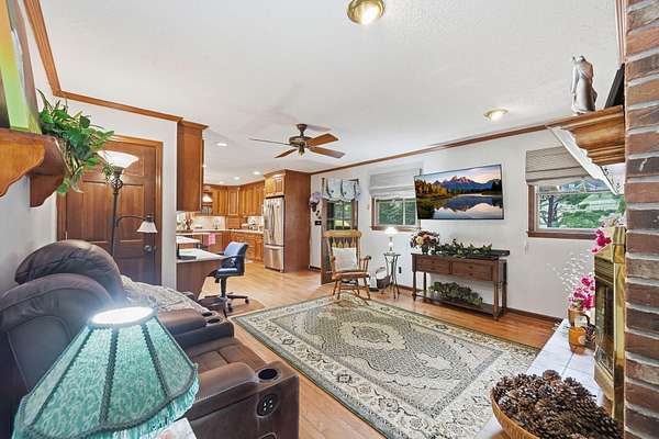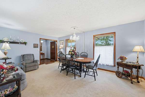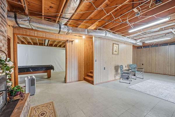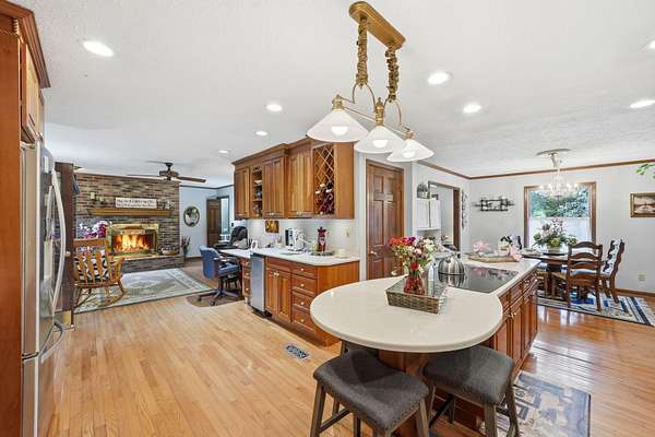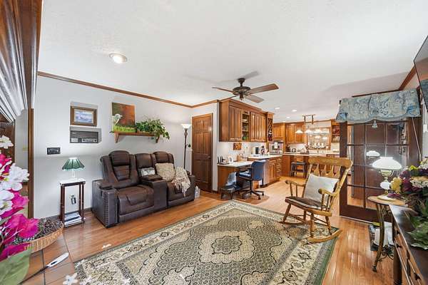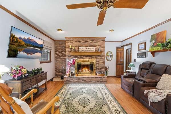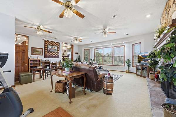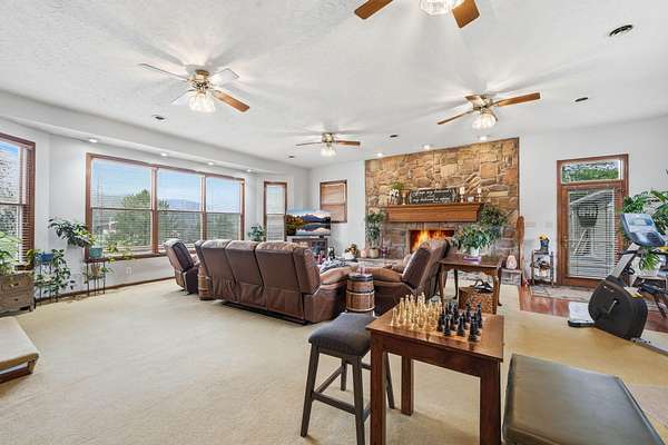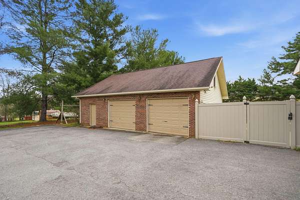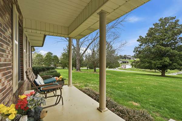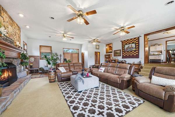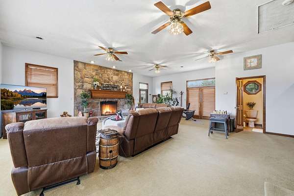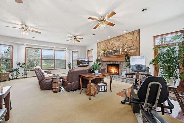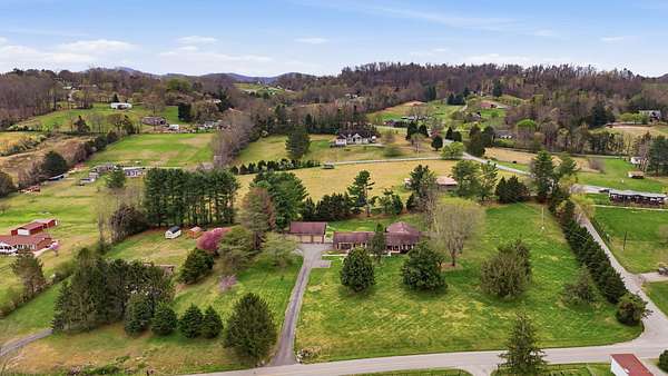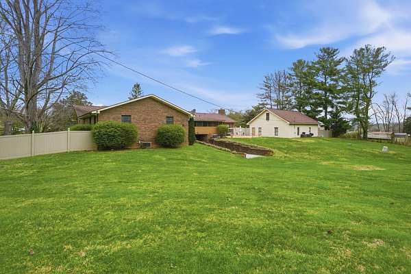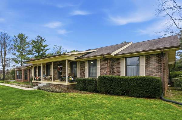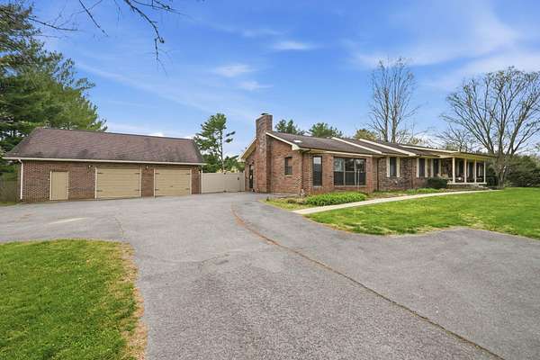 Looking for main-level living on a beautiful parcel of land? This is the one for you! Situated on 3 acres with scenic mountain views, this spacious ranch-style home is designed for both comfort and entertaining. The home features three ensuite bedrooms, offering privacy and convenience for family and guests alike. A chef's dream kitchen anchors the home, with a kitchen and breakfast room combo that opens seamlessly to the den. The den is highlighted by a cozy fireplace and wet bar--perfect for hosting. Just off the kitchen, the great room impresses with vaulted ceilings, a second fireplace, and ample space for multiple seating areas, creating an inviting gathering space. Down the hall, you'll find the bedrooms, bathrooms, and a conveniently located laundry area. The basement offers incredible potential, featuring a large room with a wood-burning fireplace and abundant natural light from the sliding glass door. Additional basement spaces include storage rooms and a bathroom, providing flexibility for future expansion or customization. Step outside to enjoy the peaceful setting from the screened-in porch--ideal for relaxing in the hot tub or simply taking in the sounds of nature. A spacious patio just off the porch is ready for grilling and outdoor entertaining. Completing the property is an oversized detached garage with two bays, a workshop area, and a loft space that offers excellent storage options.