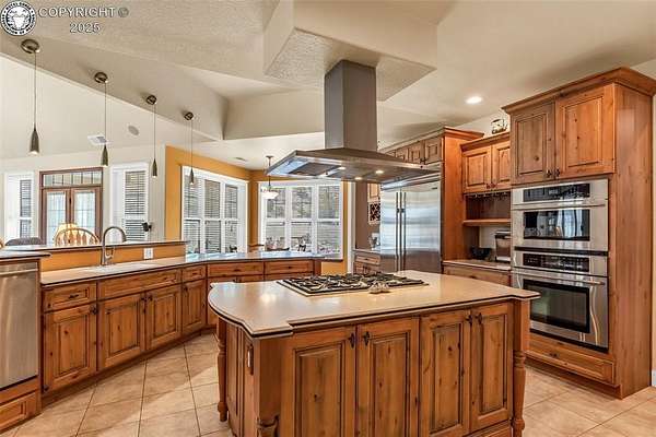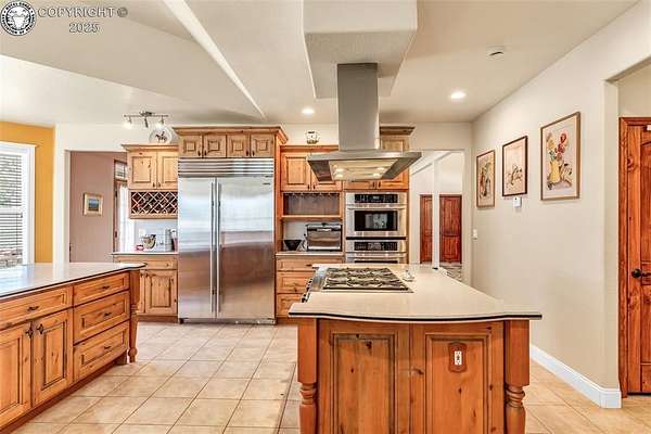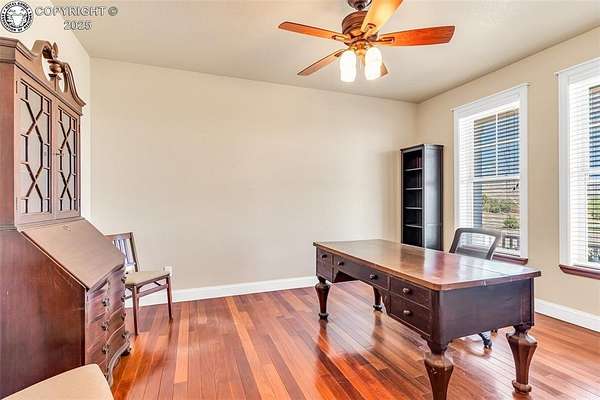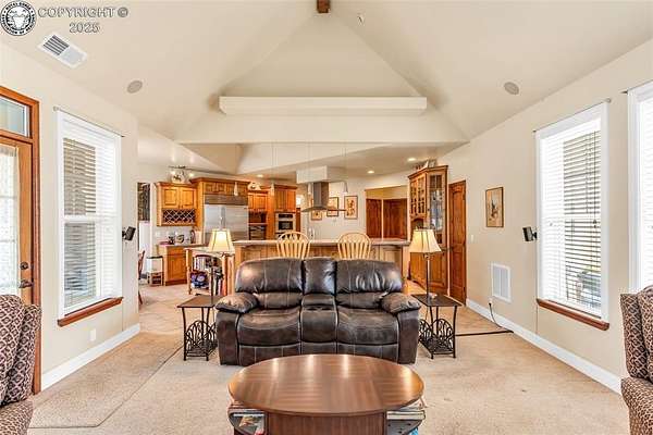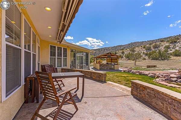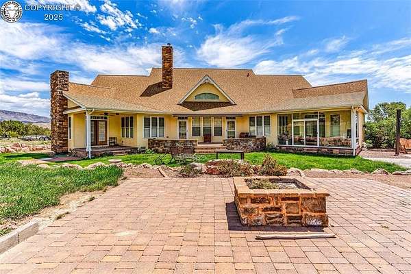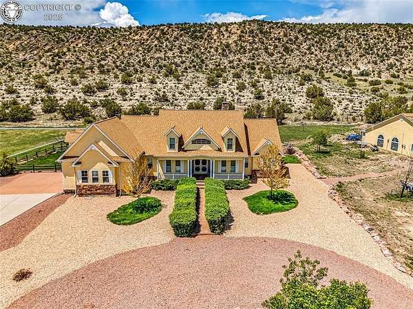 Designed & built by the builder as his retirement home on 11.76 acres with the foot of the Rocky Mountains starting in the backyard. Professionally landscaped with 15 ditch shares to irrigate 6 acres of alfalfa & hay. Paid-off solar panels atop an insulated 2400 sq ft detached garage/shop with 2 garage doors, dust collection & built-in compressed air systems. Outdoor dining area & covered outdoor kitchen with granite countertops, bar, refrigerator, sink, wood-fired pizza oven, built-in Traeger smoker, gas & Santa Maria-style grill. Back patio with hardwired retractable lighted Sunsetter awning, water feature, dog run, fire & horseshoe pit. Quite year-round outdoor living with amazing night skies, but close to downtown. Sprinkler system, exteriors newly painted & 3 new roofs. Inside the double-door entry there's radiant floor heat with 6 zones, solid wood doors, a water softener, an office, formal dining room & living room with built-in speakers + a two-story wood-burning stone fireplace with blower. Main floor primary suite with built-in speakers, 5-piece bath including Jacuzzi tub, 2 walk-in closets, gas fireplace with blower, sitting area & private patio that's wired for speakers. Half bath, laundry, family & sun rooms adjoin gourmet kitchen with custom knotty alder cabinetry + dovetailed self-closing drawers, solid-surface counters, walk-in pantry, coffee station, Sub Zero refrigerator, 6 burner gas cooktop, raised dishwasher, wall oven, microwave & casual eating nook. Upstairs guest suite with sitting area & full bath including Jacuzzi tub. Additional bedroom with walk-in closet & full bath across the hall. At the end of hall, the popcorn room leads into the media room wired for surround sound or use it as a game room or bedroom.