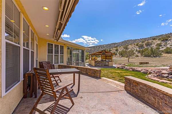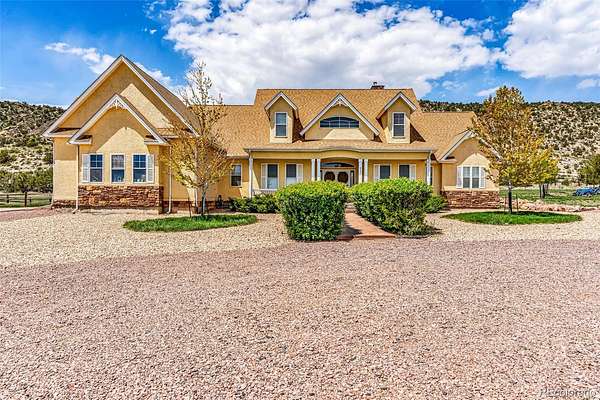 Designed & built by the builder as his retirement home on 11.76 acres with the foot of the Rocky Mountains starting in the backyard. Professionally landscaped with 15 ditch shares to irrigate 6 acres of alfalfa & hay. Paid-off solar panels atop an insulated 2400 sq ft detached garage/shop with 2 garage doors, dust collection & built-in compressed air systems. Outdoor dining area & covered outdoor kitchen with granite countertops, bar, refrigerator, sink, wood-fired pizza oven, built-in Traeger smoker, gas & Santa Maria-style grill. Back patio with hardwired retractable lighted Sunsetter awning, water feature, dog run, fire & horseshoe pit. Quite year-round outdoor living with amazing night skies, but close to downtown. Sprinkler system, exteriors newly painted & 3 new roofs. Inside the double-door entry there’s radiant floor heat with 6 zones, solid wood doors, a water softener, an office, formal dining room & living room with built-in speakers + a two-story wood-burning stone fireplace with blower. Main floor primary suite with built-in speakers, 5-piece bath including Jacuzzi tub, 2 walk-in closets, gas fireplace with blower, sitting area & private patio that’s wired for speakers. Half bath, laundry, family & sun rooms adjoin gourmet kitchen with custom knotty alder cabinetry + dovetailed self-closing drawers, solid-surface counters, walk-in pantry, coffee station, Sub Zero refrigerator, 6 burner gas cooktop, raised dishwasher, wall oven, microwave & casual eating nook. Upstairs guest suite with sitting area & full bath including Jacuzzi tub. Additional bedroom with walk-in closet & full bath across the hall. At the end of hall, the popcorn room leads into the media room wired for surround sound or use it as a game room or bedroom. This property is truly a remarkable blend of luxury, comfort and funcionality waiting for you to call it home!!! Call for a showing today.