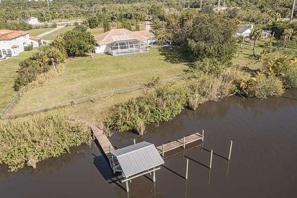 BACK ON MARKET WITH BRAND NEW ROOF!! What a fantastic opportunity to own almost 2.5 acres of WATERFRONT property! This 3BR/2BA CBS home sits right on the deep waters with access to the Atlantic, Gulf and Okeechobee waterways! Features a private dock with a lift and a view that goes on forever!! Watch the boats go by from your screened lanai (new screens just installed) and recently updated pool. The home features tastefully updated bathrooms, a split bedroom plan, tile floors throughout and new water filtration system. The light and bright white kitchen boasts granite countertops, stainless appliances, gas range, wine fridge & a view of the river from your kitchen island! 1/2 acre of property across the road is perfect for a car enthusiast or to house your toys/RV etc. NO HOA