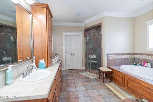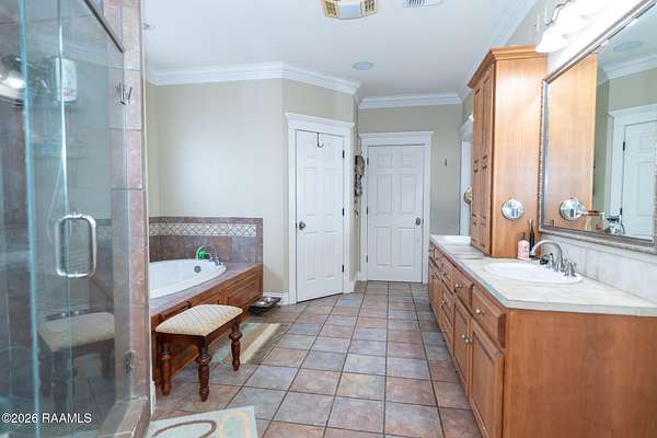 - 9+ ft Ceiling, Attic Access, Built-In Features, Built-Ins, Crown Molding, Double Vanity, Garden Tub, High Ceilings, Primary Bath, Separate Shower, Walk-In Closet(s)