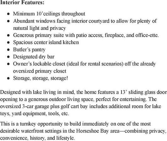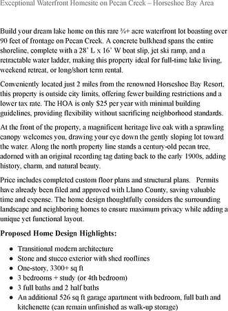 Pecan Creek Waterfront Homesite~Horseshoe Bay Area. Build your dream lake home, rare 3/4 acre waterfront lot, 90+ ft. frontage on Pecan Creek. Concrete bulkhead spans entire shoreline, complete 9.75'W x 26'L boatslip, jetski ramp & retractable dock ladder. Lot location just 2mi from renowned HSB Resort. Property outside city limits allows for low tax rate & ease of new construction. $25/yr HOA w/ minimal build guidelines, allowing ST/LT rentals. Sprawling heritage oak welcomes you at the street & century-old pecan tree tagged in early 1900s located on north prop. line. Price includes custom floor plans& structural plans. Permits filed&approved w/Llano Co, saving buyer time &expense. Prof designed w/lake living & entertaining in mind. 13'Wx9'H sliding glass door opens to generous outdoor living area, owner's closet(ideal for rental) off oversized primary closet, full bath steps away from covered patio. Home design touts a 1story, 3300+sf transitional modern w/ shed rooflines. 3 beds+study(or 4th bed),3 full baths & 2 half. Plan calls for 526sf garage apt w/bed, full bath & kitchenette(leave unfinished for walk up storage). Interior: 10'+ceiling thru-out, abundant windows facing interior courtyard to provide natural light & privacy, generous primary suite w/patio access, fireplace & office-ette. Open concept kitchen boasts large center island, butlers pantry, designated drybar. Oversized 3car garage+golfcart bay including extra room for lake toys or workshop. Plenty of yard avail for pool or additional ent.