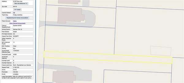 Two adjoining vacant lots offered together at 6127 & 6129 Tracy Ave, Kansas City, MO. Combined size approx. 10,600 sq ft (0.24 acres). Zoned R-6 Residential, allowing single-family construction (meets minimum lot size). Lots are level, cleared, partially fenced, with utilities available at street (buyer to verify). Great central location near UMKC, Rockhurst, Troost Corridor, and Hwy 71. Quick drive to Downtown, Plaza, and Brookside. Ideal for builder, investor, or custom home site. Rare chance to secure a double lot in an up-and-coming neighborhood. The lots at 6127 Tracy Ave and 6129 Tracy Ave, Kansas City, MO 64110, will be sold together as a package. Please refer to MLS # 2575726.