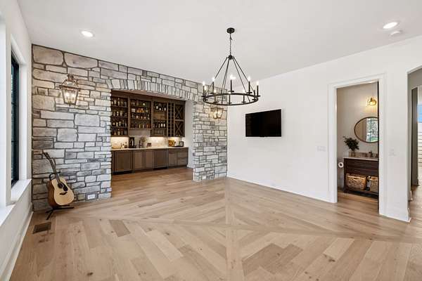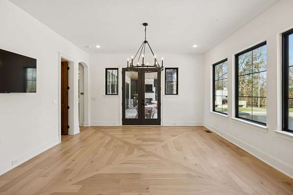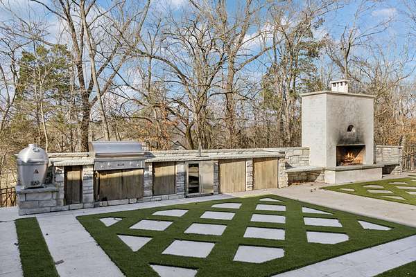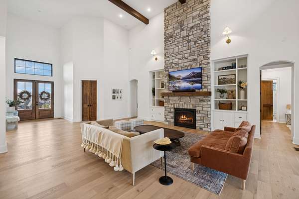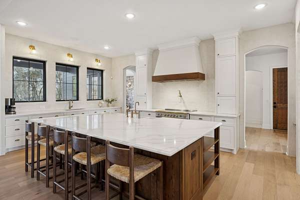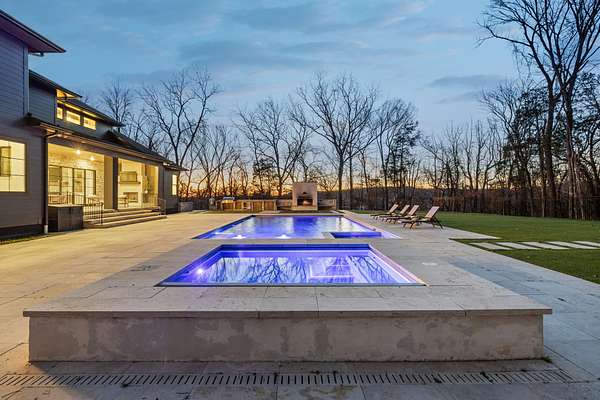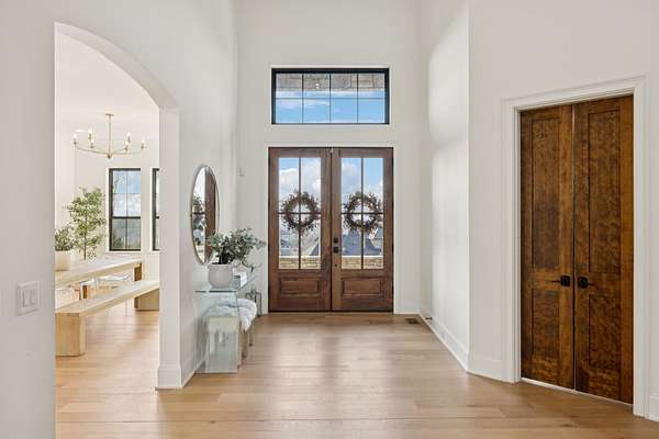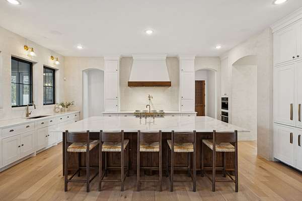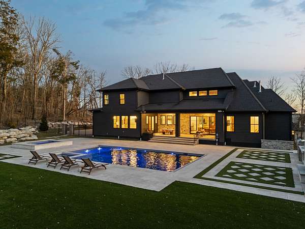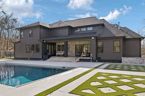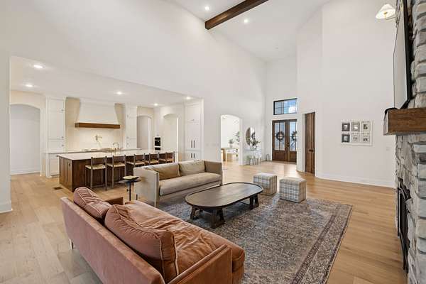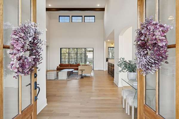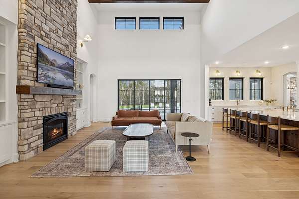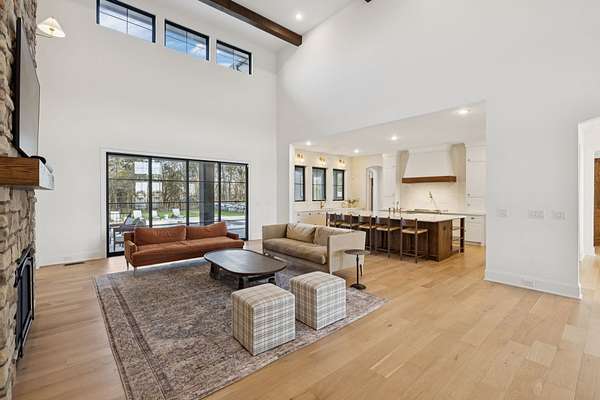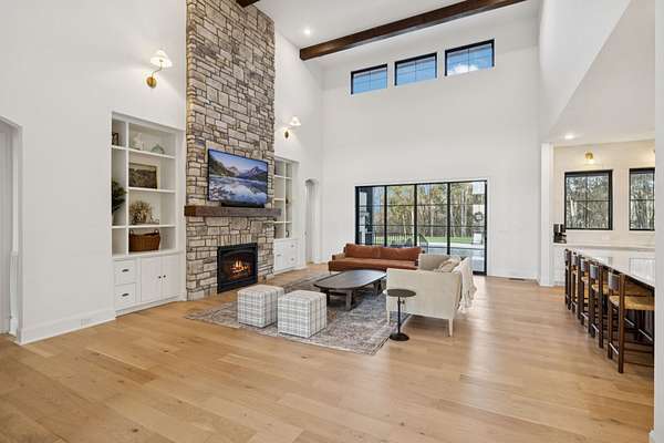 Open House Sat 3pm-5pm! Nestled in the highly desirable Lookaway Farms community, this exceptional custom-built luxury estate rests on 2+ private acres backing to peaceful, treed common space. Situated within a rare private enclave approved for a future gated entrance. Step inside to grand soaring ceilings accented by beautiful wood beams and impeccable details throughout. A private office sits behind custom wood doors. The spacious living room showcases built-in bookcases and a stacked-stone floor-to-ceiling gas fireplace. The chef's kitchen boasts abundant white cabinetry, quartz countertops, custom vent hood, tiled backsplash, full sink and prep sink, top-of-the-line Miele appliances, pot filler, two dishwashers, and an oversized island. The home also features a central vacuum and a fully customized walk-in pantry with floor-to-ceiling cabinetry. The luxurious primary suite offers a private sitting area overlooking the serene backyard. The ensuite bath features separate vanities, a freestanding soaking tub, a dual-entry walk-in shower with rain head, and a custom walk-in closet. An additional ensuite bedroom is conveniently located on the main level. The main floor is completed by an elegant sitting area with a full wet bar featuring custom cabinetry, wine refrigerator, and prep sink--ideal for a game room or wine lounge. Upstairs, you'll find three additional spacious ensuite bedrooms, each with full bathrooms and custom walk-in closets, along with a second laundry room. The upper level also features a dedicated movie theater with surround sound and a bonus room with access to a private balcony. Step outside to an entertainer's paradise designed for seamless indoor-outdoor living. Expansive four-panel sliding doors lead to an extended covered porch and resort-style saltwater gunite pool complete with tanning ledge, spa, and cold plunge. The outdoor kitchen is fully equipped with a smoker, grill, fireplace, and pizza oven, all set on an expansive travertine patio.