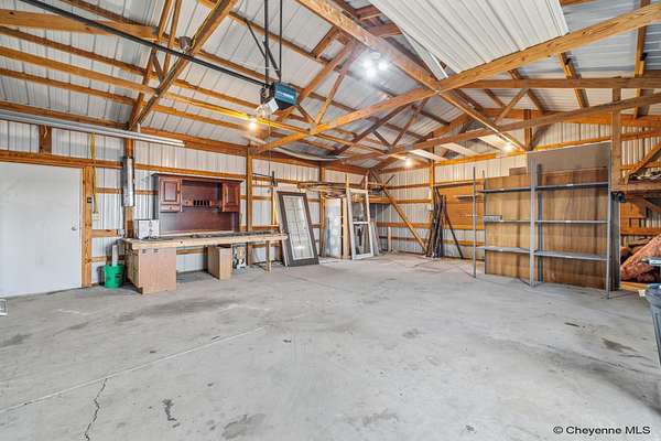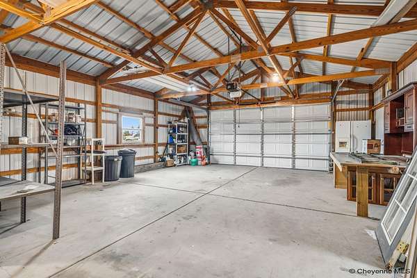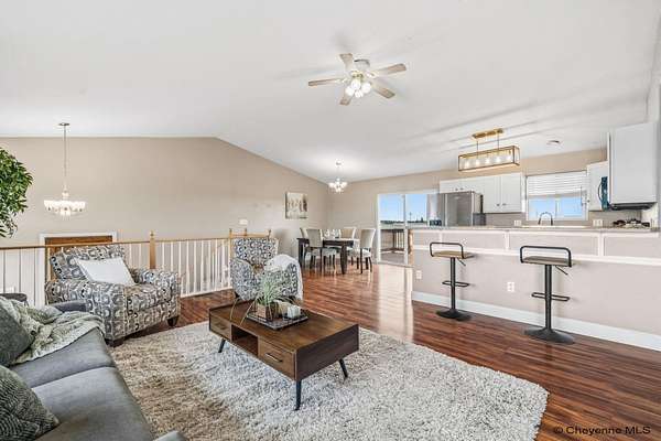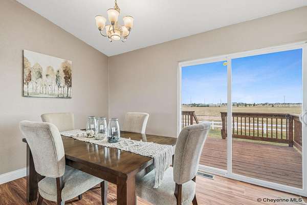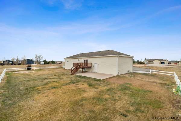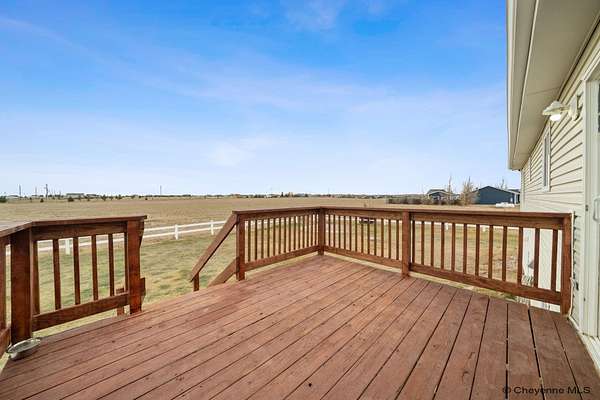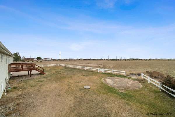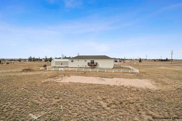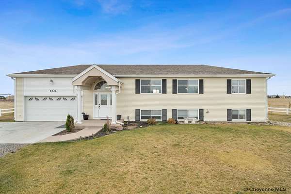 Discover the perfect blend of open-space living and everyday convenience at 6132 Bison Run Loop. Set on 4.69 acres with sweeping views of the wide-open prairie, this split-level home delivers room to breathe, play, and truly settle in. Inside, you'll find an exceptionally open floor plan--the kitchen and dining area flow seamlessly into a massive main-level living room, ideal for gathering and entertaining. A full bathroom on each level adds effortless functionality. Upstairs, enjoy two large bedrooms, while the lower level features a spacious suite complete with a large walk-in closet and an attached office, nursery, or craft room to fit your lifestyle. The lower level living room/rec room offers a cozy fireplace and generous space for relaxing or hosting game nights. Step outside and enjoy the best of country living: an oversized deck, a stamped-concrete patio, and plenty of room to roam. The impressive shop with concrete floors and electrical is ready for hobbies, storage, or projects. And the attached garage includes a clever chicken-coop addition--just add fencing, and you can collect eggs without braving the Wyoming wind. All of this is tucked in a rural setting that feels miles away, yet you're still close to town and just off the paved road. Your prairie escape awaits at Bison Run Loop.