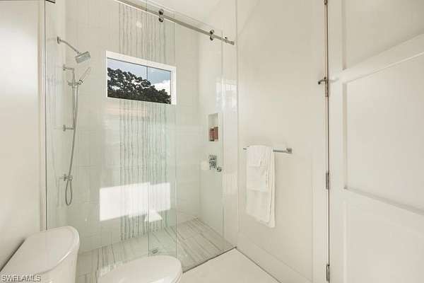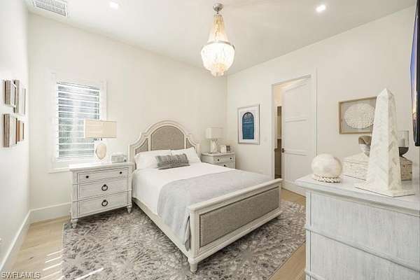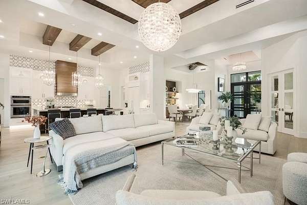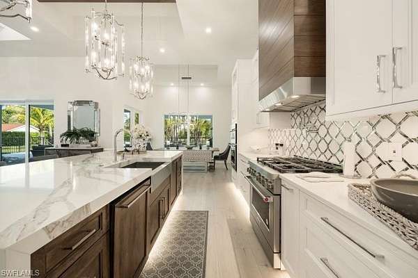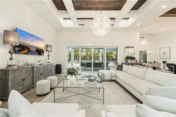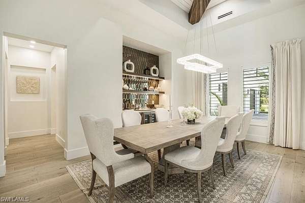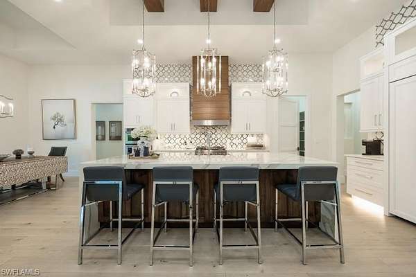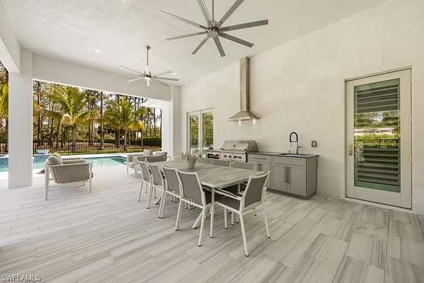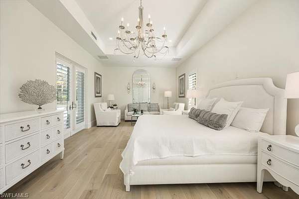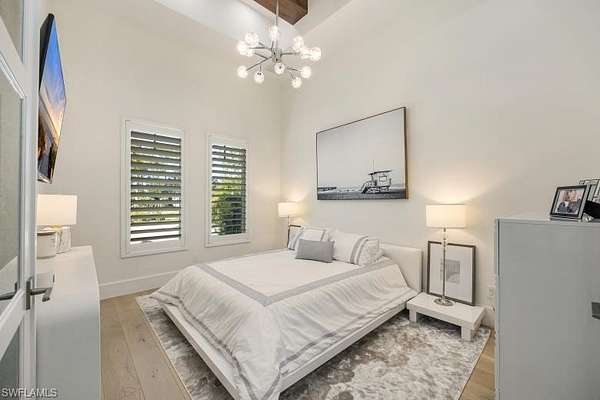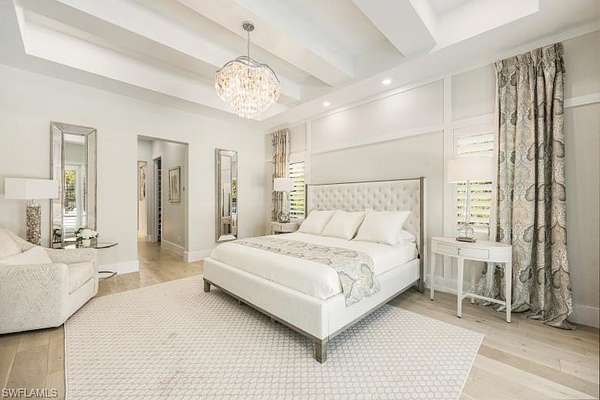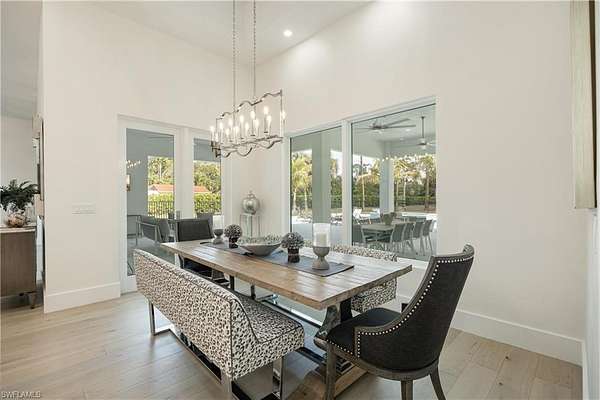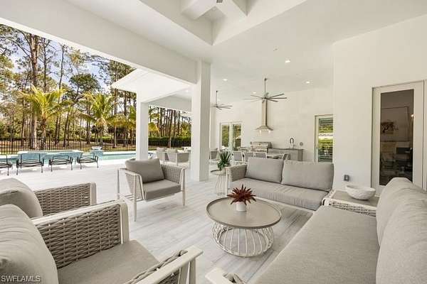 Welcome to Your Private Paradise in the Heart of Naples! Drive through the privacy gate into your own secluded oasis-2.27 acres of fully fenced and beautifully landscaped property that combines luxury, peace, and convenience. A palm tree-lined paver driveway leads you to this impeccably designed estate, offering the ultimate in indoor-outdoor living. The centerpiece of the outdoor space is a stunning custom pool with a spa, sun shelf, and dramatic fire bowls-perfect for relaxing or entertaining in a true resort-style setting. Enjoy the expansive covered outdoor living area, complete with an outdoor kitchen and fire pit, ideal for hosting family and friends year-round. Inside, the home features exquisite finishes throughout, including white oak wood floors, custom maple ceilings and beams, and a show-stopping kitchen with mixed wood cabinetry, Pompeii Venetta quartz countertops, and a large island perfect for gathering. This thoughtful split floor plan ensures both privacy and functionality. One oversized bedroom offers flexible use as a second master suite, in-law quarters, media room, or bonus space to suit your lifestyle. Tucked away in peaceful seclusion yet just minutes from Naples' finest beaches, restaurants, and shopping, this is truly a one-of-a-kind opportunity to own a luxurious retreat in one of Florida's most desirable locations.